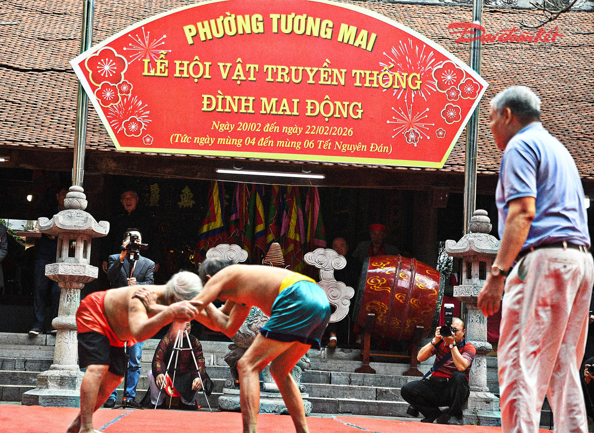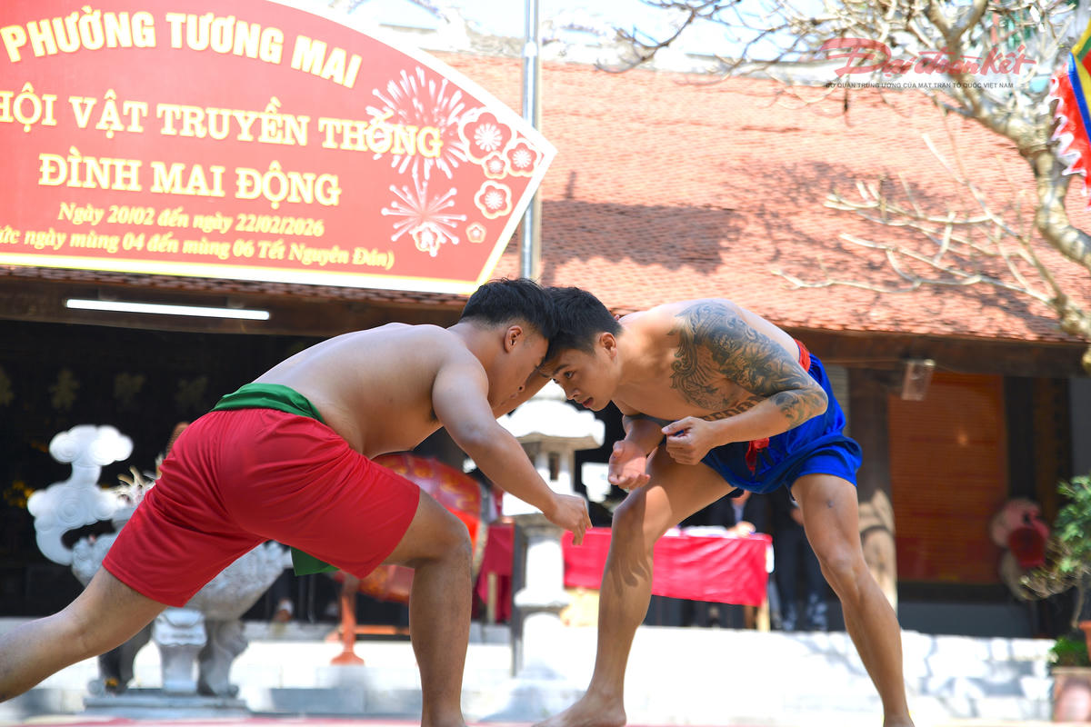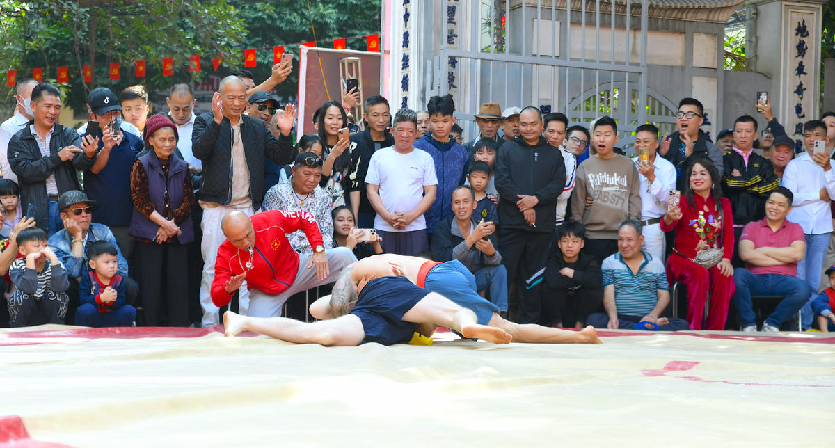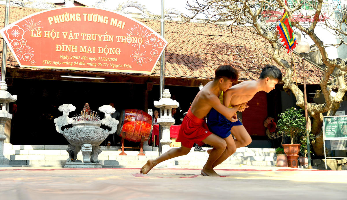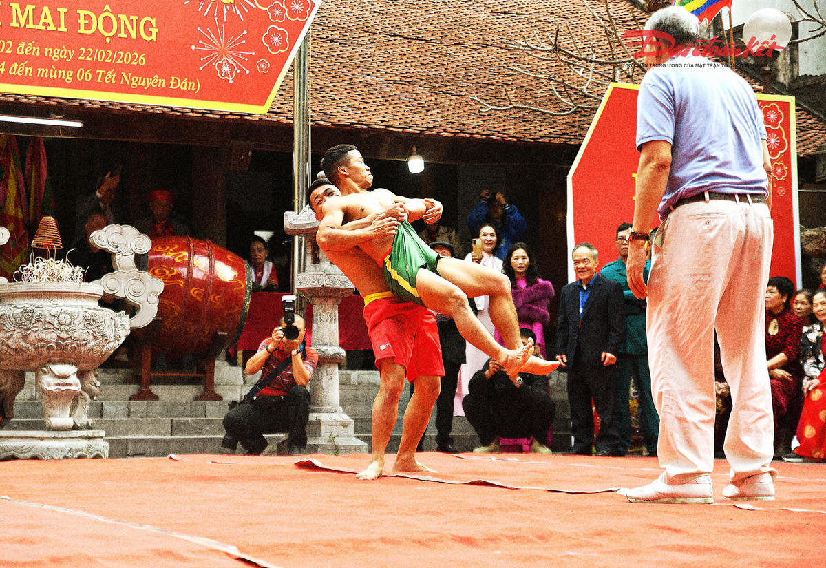 Trên nền cờ hội rực sắc, những màn so tài quyết liệt góp phần làm nên khí thế tưng bừng của lễ hội vật Mai Động. Không chỉ sôi động với đô vật trong nước, sới vật Mai Động còn chào đón sự góp mặt của các đô vật quốc tế, làm tăng thêm sức nóng cho từng trận đấu. Ảnh: Phạm Sỹ.