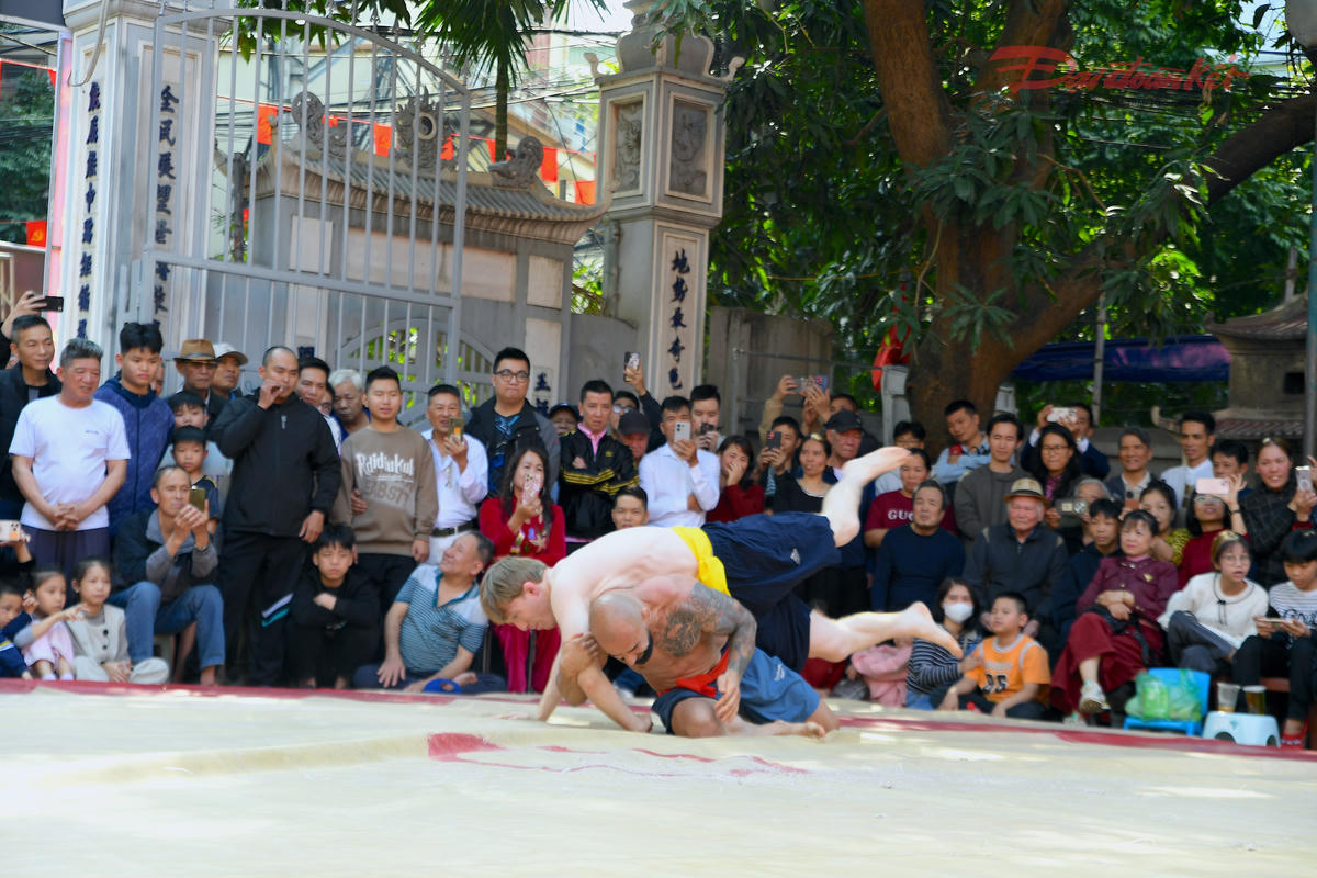 Đô vật nước ngoài tự tin bước vào sới, mang theo phong cách thi đấu hiện đại, tạo nên màn so tài đa sắc màu văn hóa. Sự hiện diện của các vận động viên quốc tế góp phần khẳng định uy tín và sức hút ngày càng rộng mở của hội vật Mai Động. Ảnh: Phạm Sỹ.