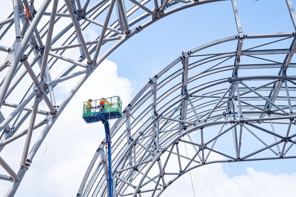 Để thi công hệ mái này, các cấu kiện được chia thành nhiều modul, trong đó có những modul nặng tới gần 250 tấn, được tổ hợp và lắp dựng bằng công nghệ kích rút thủy lực tiên tiến từ Hebetec (Thụy Sĩ), cho phép kiểm soát chính xác từng chuyển động trong quá trình thi công.