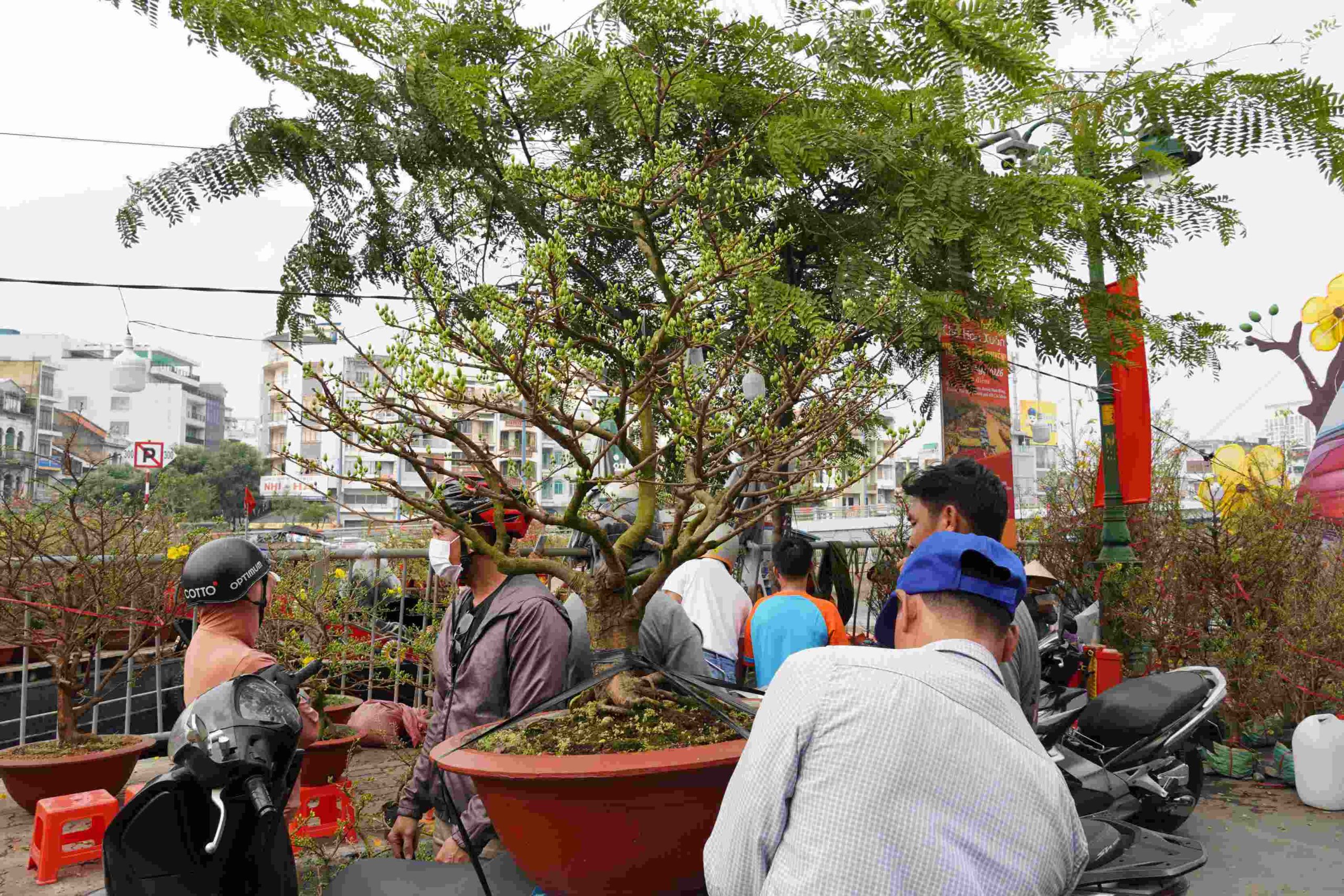 Một tiểu thương từ làng mai Bình Lợi (TPHCM) cho biết lượng khách năm nay ổn định. “Khách chuộng cây nhiều nụ, đang ‘ôm’ búp, dự kiến nở đúng Tết. Những ngày này bán khá đều”, tiểu thương nói. Ảnh: Nguyên Phong