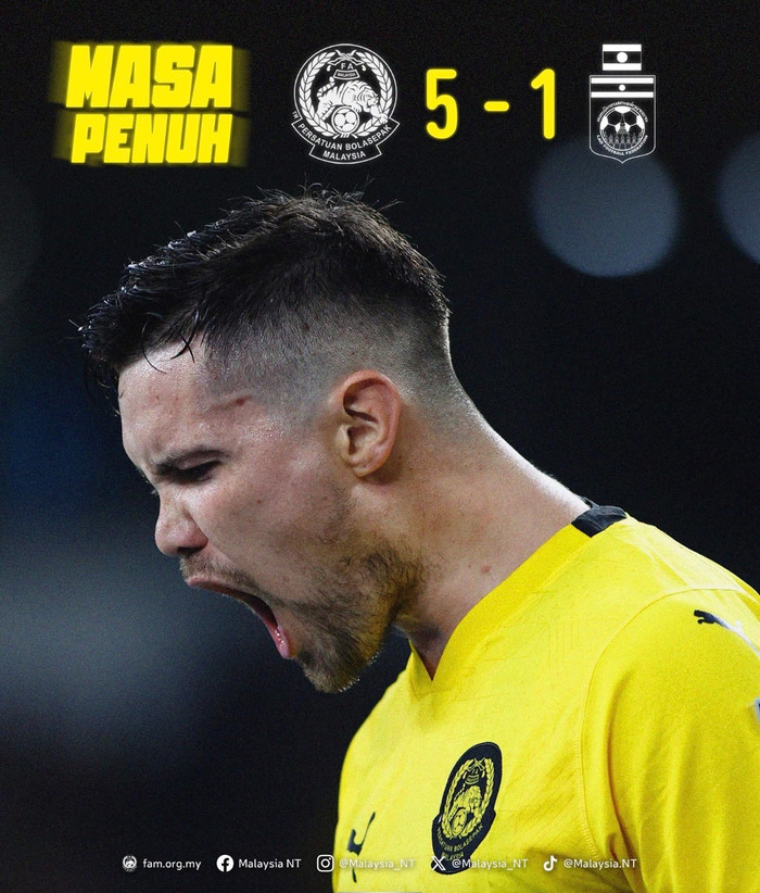 Malaysia đã có chiến thắng tưng bừng 5-1 trước Lào ở lượt trận thứ tư bảng F vòng loại Asian Cup 2027. Ảnh: Malaysia NT