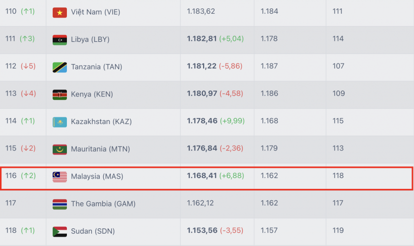 Kết quả này giúp Malaysia được cộng 6,68 điểm trên bảng xếp hạng FIFA, tăng 2 bậc từ vị trí 118 lên 116 thế giới. Đây được xem là một bước tiến đáng ghi nhận của đội tuyển này trong thời gian gần đây.