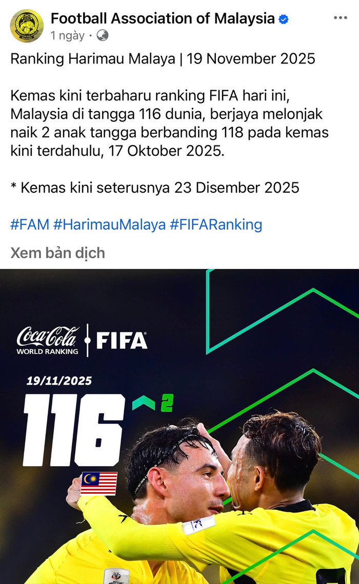 Cụ thể, Liên đoàn Bóng đá Malaysia thông báo trên trang chủ: “Xếp hạng tuyển Malaysia cập nhật từ ngày 19/11/2025. Theo cập nhật mới nhất của BXH FIFA hôm nay, Malaysia đứng ở vị trí 116 thế giới, tăng 2 bậc so với vị trí 118 trong bản cập nhật trước đó ngày 17/10/2025”.