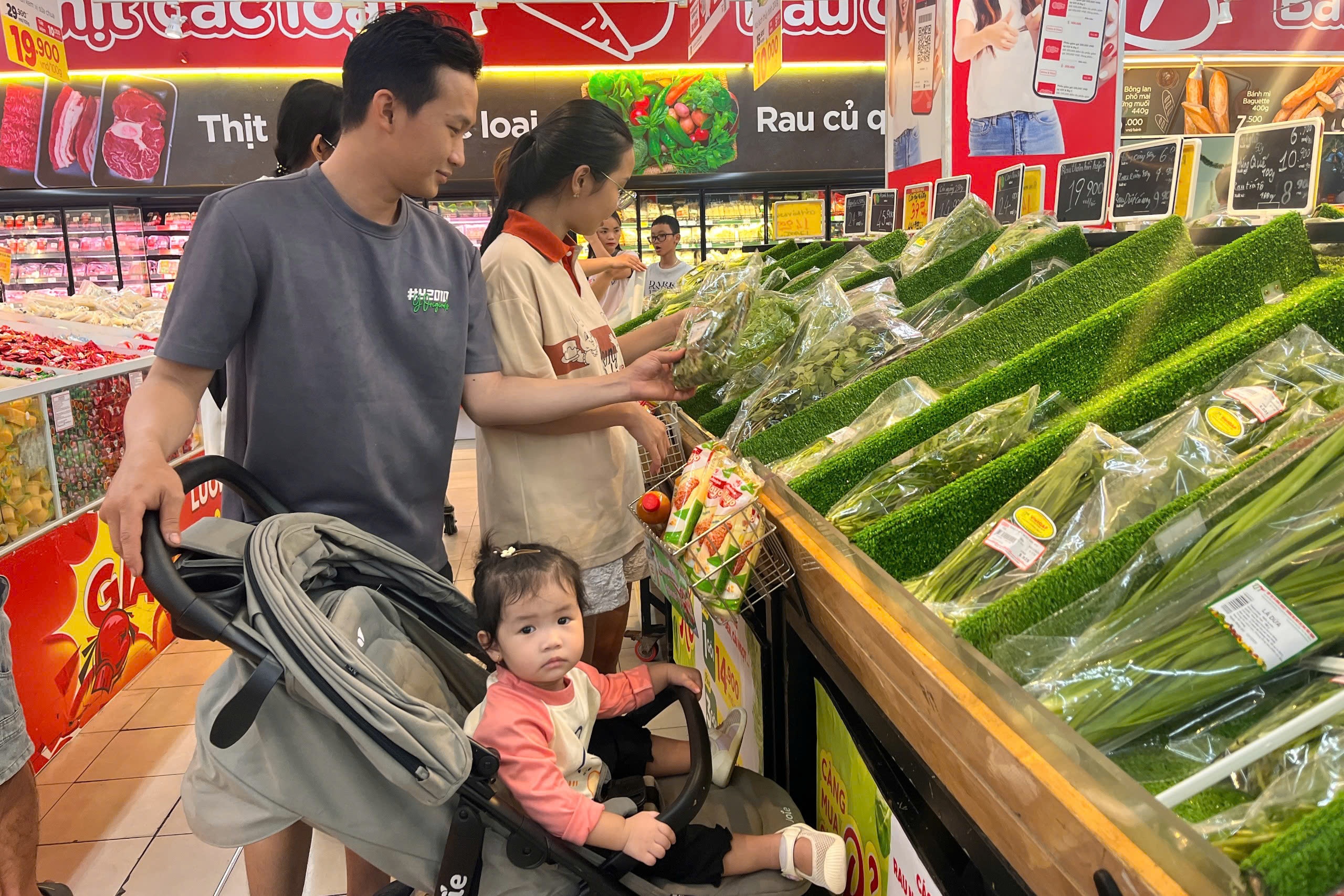 Gia đình chị Thảo Sương đắn đo khi đứng trước quầy rau tại siêu thị. Ảnh: An Khánh.