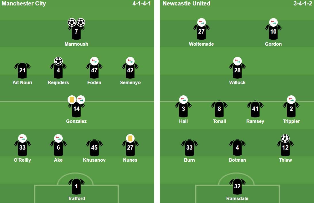 Dù nắm lợi thế dẫn bàn từ lượt đi, Pep Guardiola vẫn thể hiện sự tôn trọng đối thủ khi tung ra đội hình giàu sức tấn công với Phil Foden và Omar Marmoush. Ngược lại, Eddie Howe kỳ vọng vào một cuộc lật đổ bằng sơ đồ ba trung vệ nhằm phong tỏa không gian của đội chủ nhà. Tuy nhiên, kế hoạch này sớm đổ vỡ ngay từ phút thứ 7.