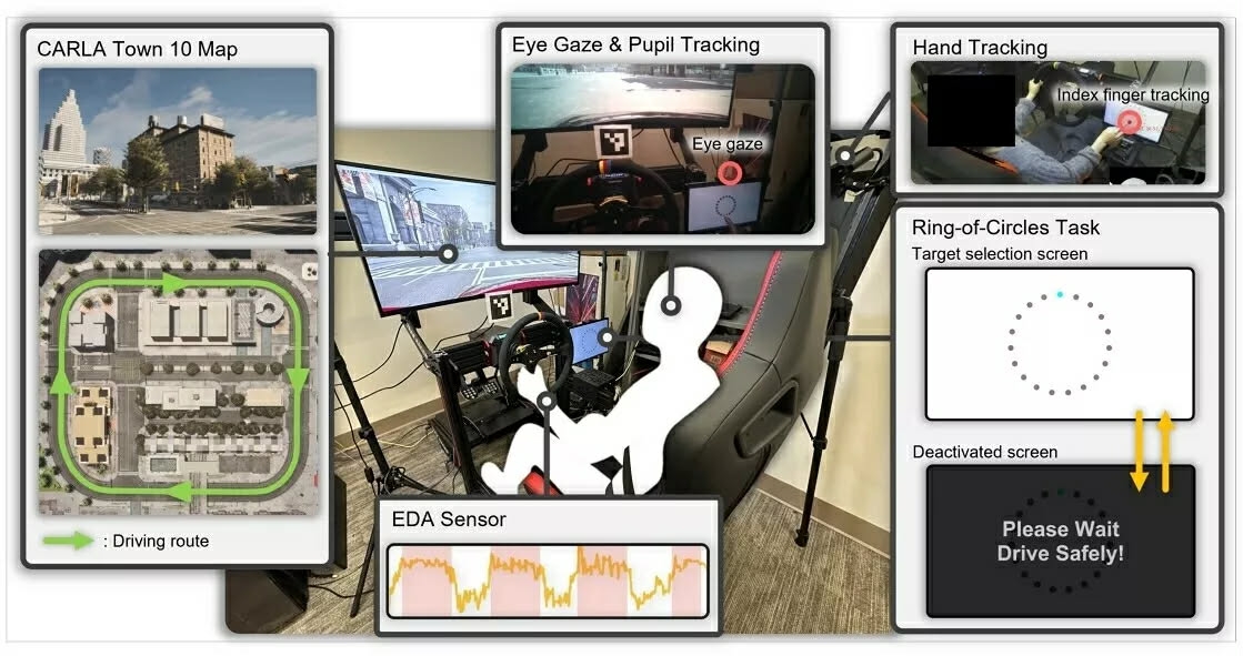 Trong thử nghiệm, 16 người tham gia lái xe trong môi trường mô phỏng đô thị và được yêu cầu tương tác với màn hình cảm ứng trong khi điều khiển phương tiện. Các nhà nghiên cứu theo dõi chuyển động mắt, tay, kích thước đồng tử và phản ứng điện da để đo tải nhận thức của người lái. Kết quả cho thấy khi tài xế thực hiện các thao tác trên màn hình chẳng hạn điều chỉnh âm lượng, chọn nhạc hoặc truy cập các mục khiến hiệu suất lái giảm rõ rệt.