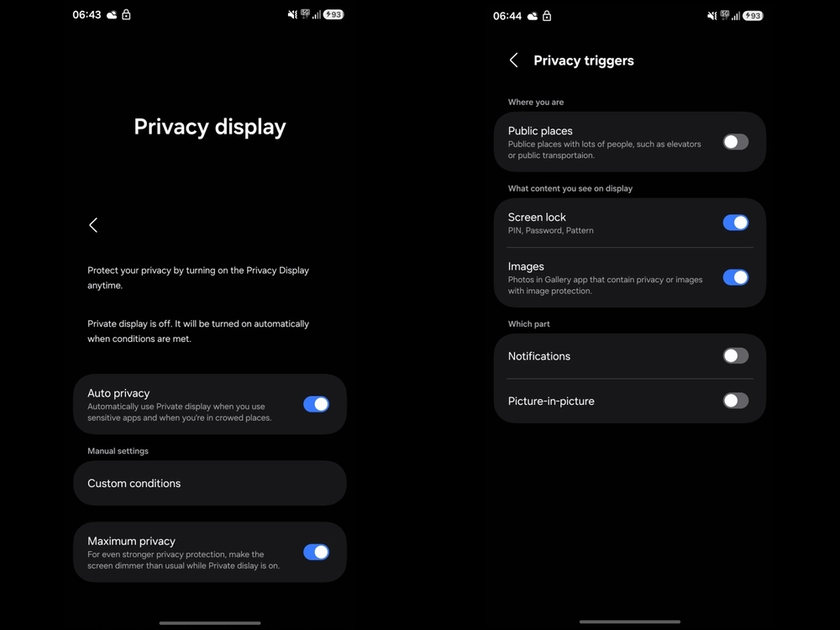 Một điểm đáng chú ý là tính linh hoạt. Theo Gadgets 360, người dùng có thể kích hoạt chế độ riêng tư theo ngữ cảnh: tự động bật khi mở ứng dụng ngân hàng, nhập mật khẩu, hoặc chỉ bảo vệ một phần màn hình như vùng thông báo và bàn phím . Nhờ đó, trải nghiệm hiển thị tổng thể không bị "hy sinh" vì bảo mật.