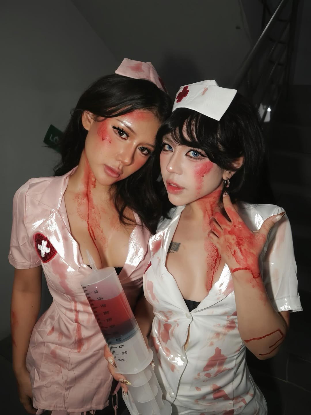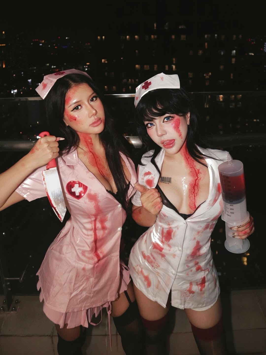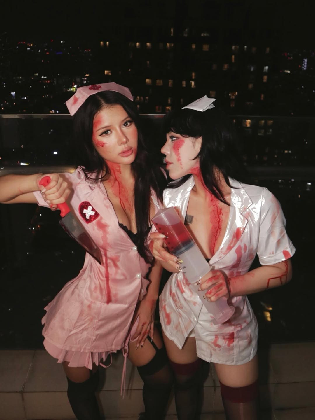 Trong loạt ảnh mới được tung ra, hai hot girl đình đám đã biến hóa thành những "y tá sát nhân" đẫm máu. (Ảnh: IG @xun.ca_)