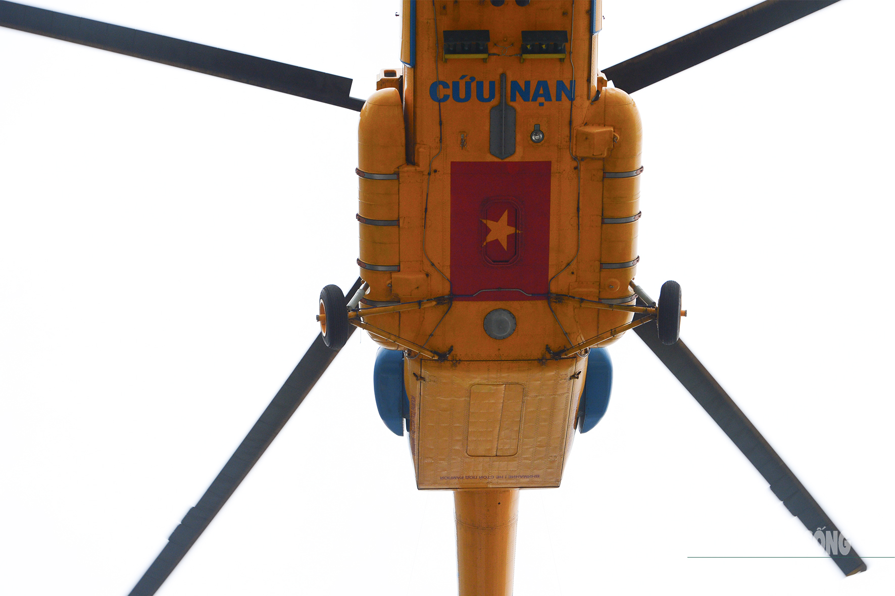 Cận cảnh bụng trực thăng “cứu nạn” với dòng chữ CỨU NẠN và quốc kỳ, lơ lửng trên khu vực diễn tập.