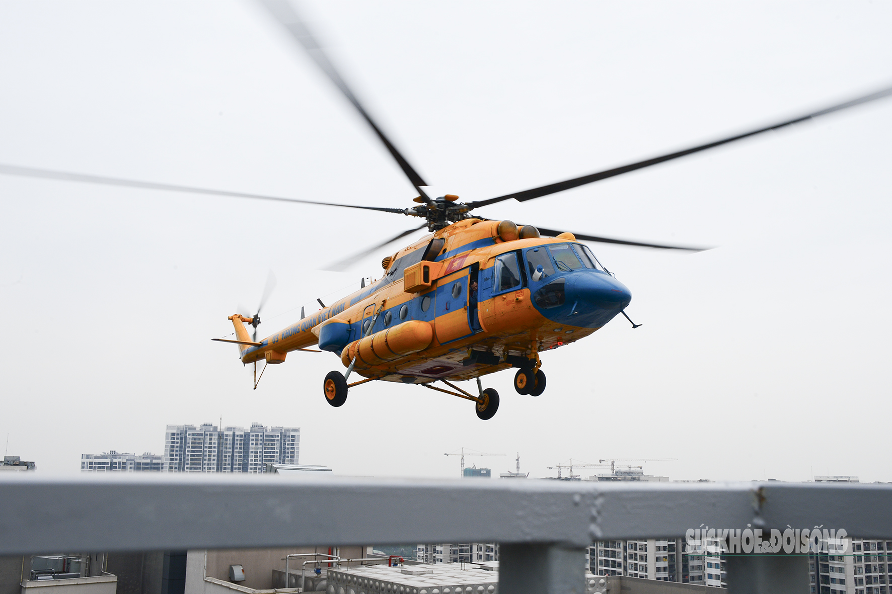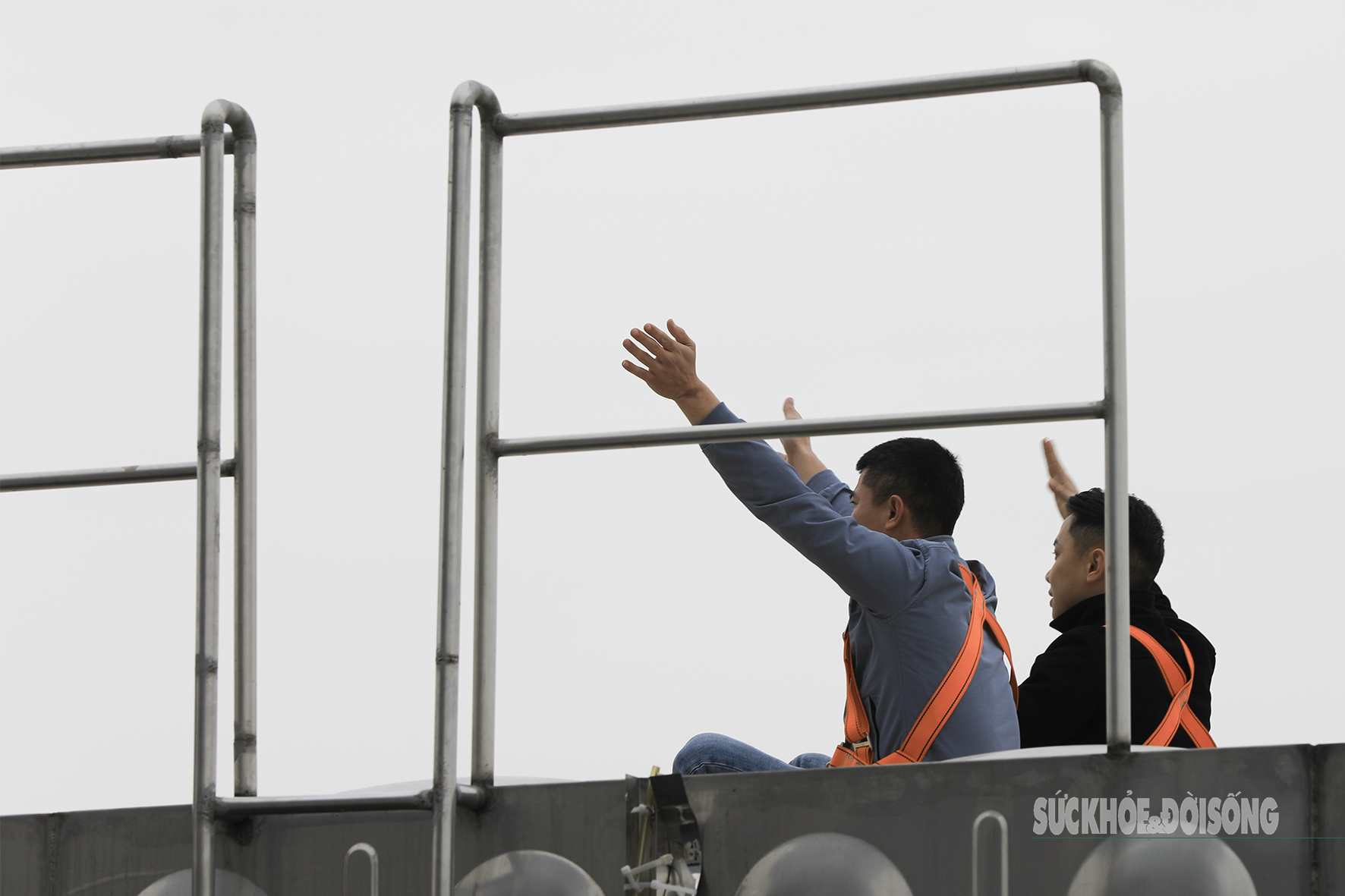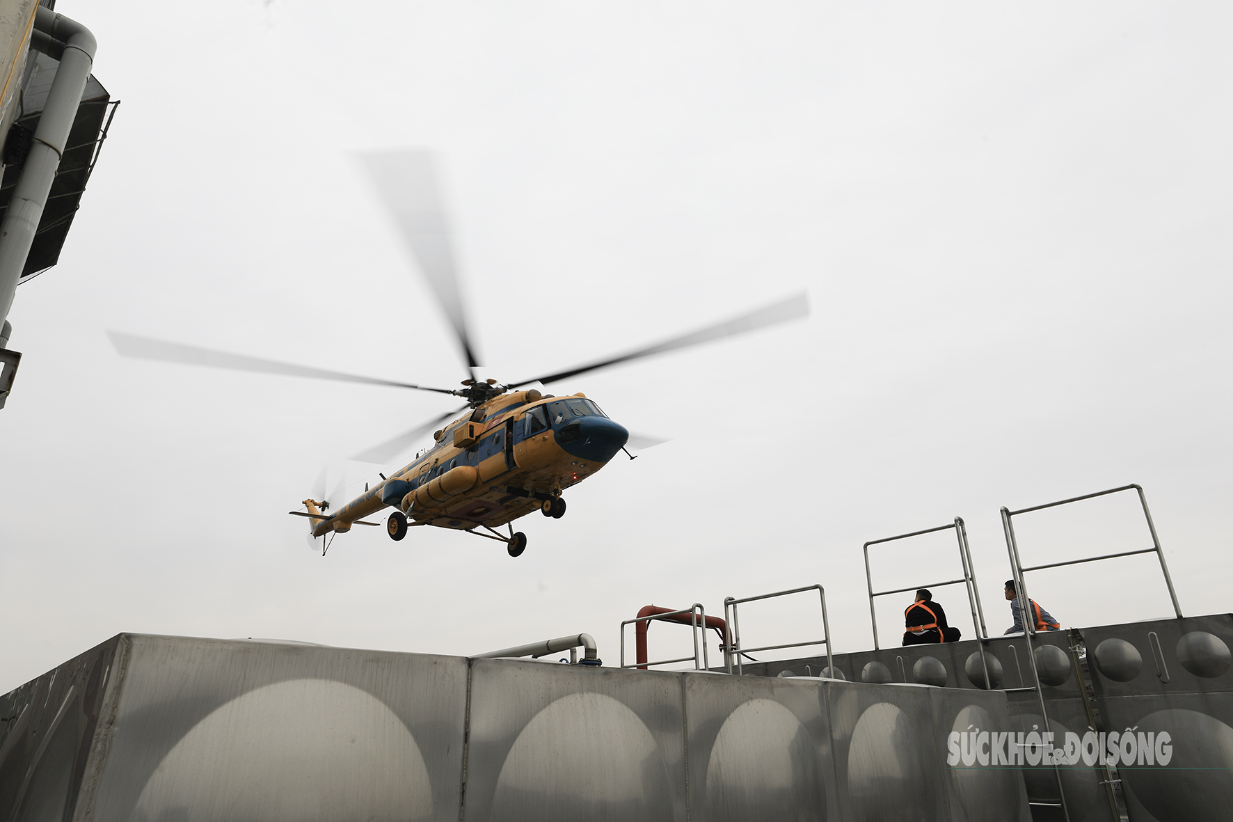 Tổ công tác trên mái ra ký hiệu điều phối, hướng dẫn trực thăng giữ vị trí an toàn trong lúc thao tác.