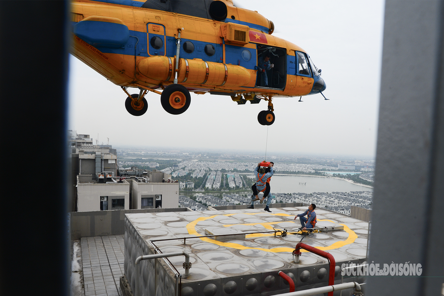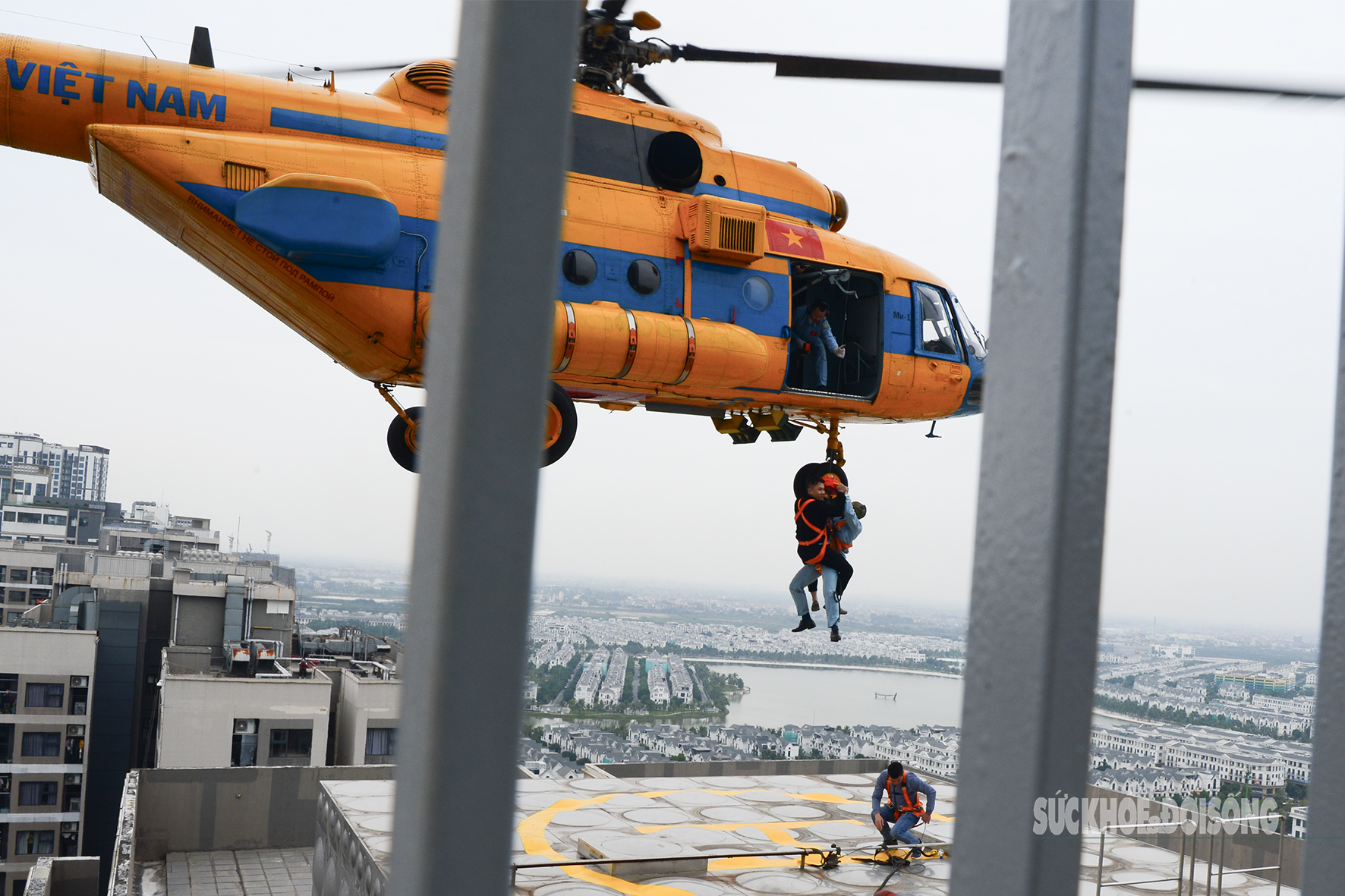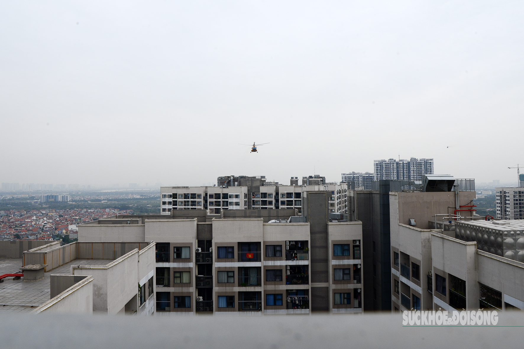 Từ trên cao, trực thăng cứu hộ xuất hiện ở đường chân trời, tiếp cận cụm nhà cao tầng để triển khai phương án giải cứu.