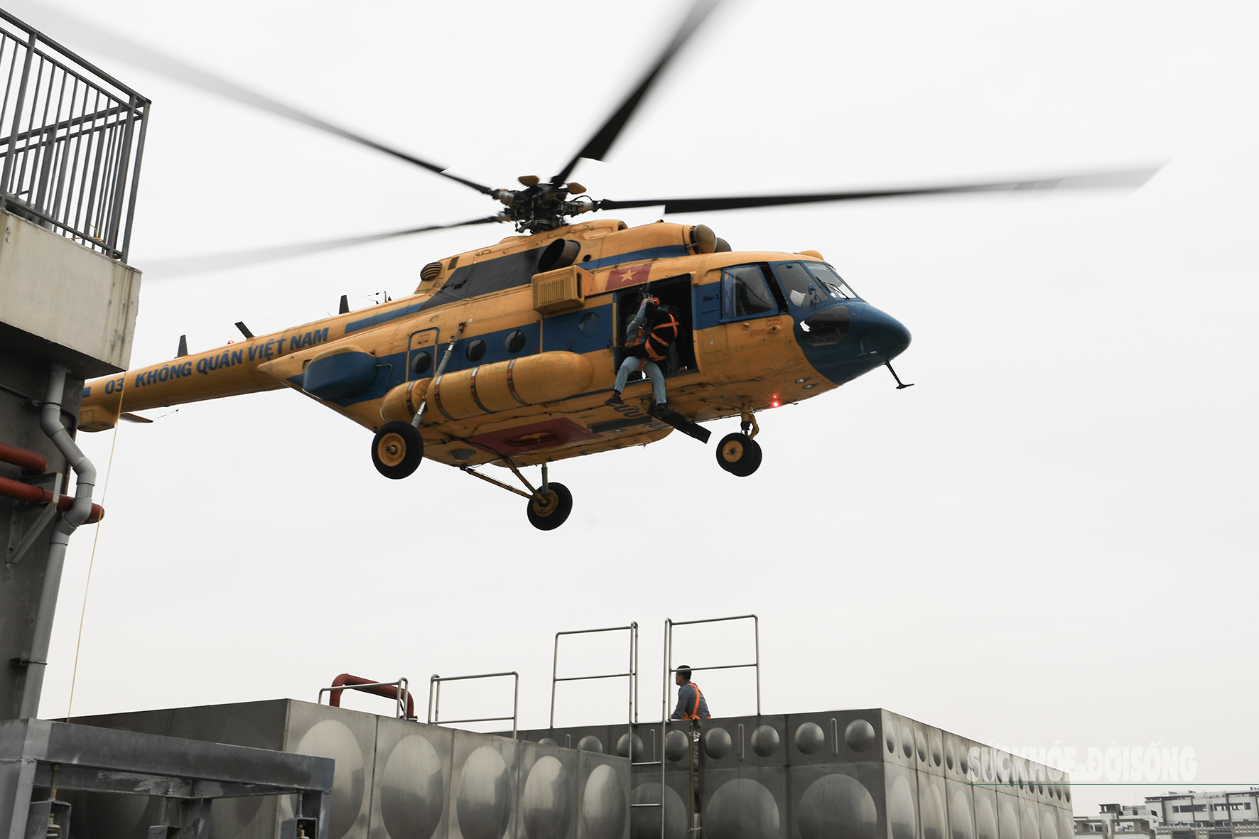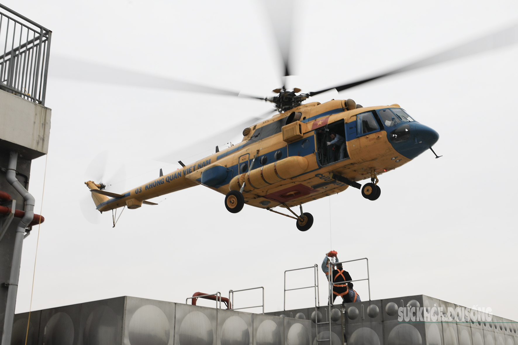 Trực thăng bay treo sát mái nhà, giữ độ cao ổn định trước khi thả dây tời.