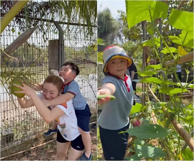 Con trai Chi Bảo chia sẻ khoảnh khắc cậu con trai hăng hái khám phá khu vườn. Ảnh chụp màn hình