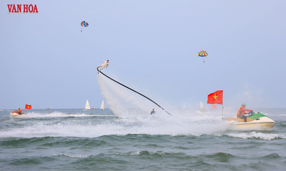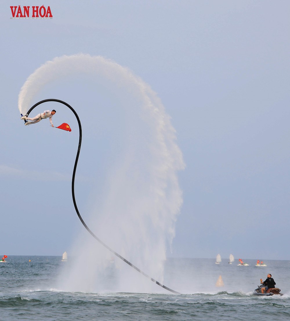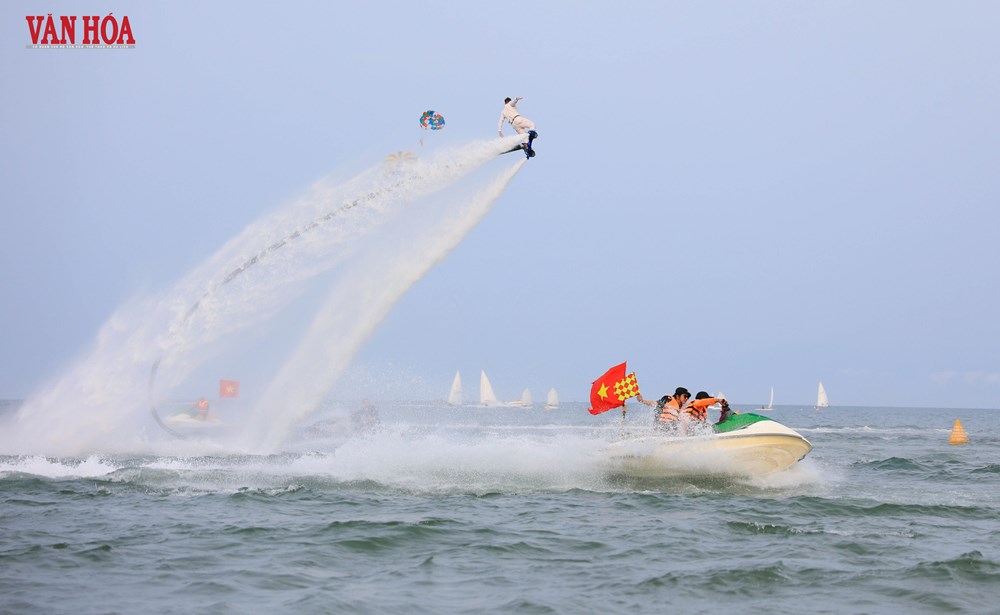 Trong không gian biển rộng mở, màn đồng diễn nghệ thuật thể thao biển mang tên “Vũ khúc đại dương” quy tụ nhiều bộ môn như jet ski, thuyền buồm, cano kéo dù và flyboard, góp phần tạo nên một “bức tranh chuyển động” sống động, giàu cảm xúc