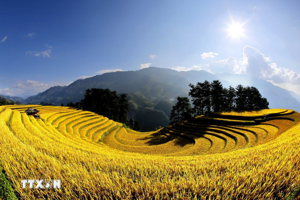 Từng thửa ruộng bậc thang nối nhau như sóng vàng mềm mại trải dài đến tận chân trời. (Ảnh: Tuấn Anh/ TTXVN)
