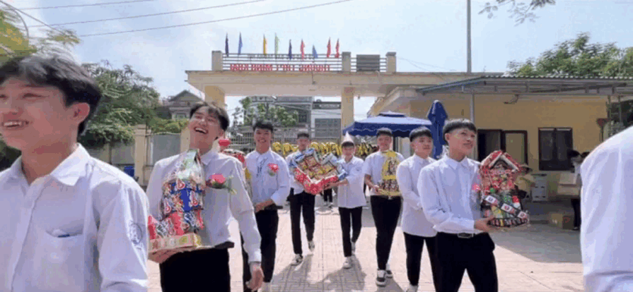 Hình ảnh các nam sinh bê dàn "tráp sính lễ" có 1-0-2. Ảnh cắt từ clip. (Nguồn: @a4k38thptminhkhai)