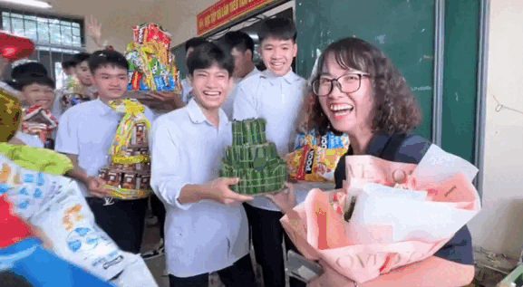 Trước sự chuẩn bị của các nam sinh, cô giáo và các bạn nữ trong lớp đều vỡ òa hạnh phúc với món quà bất ngờ và đáng yêu này.