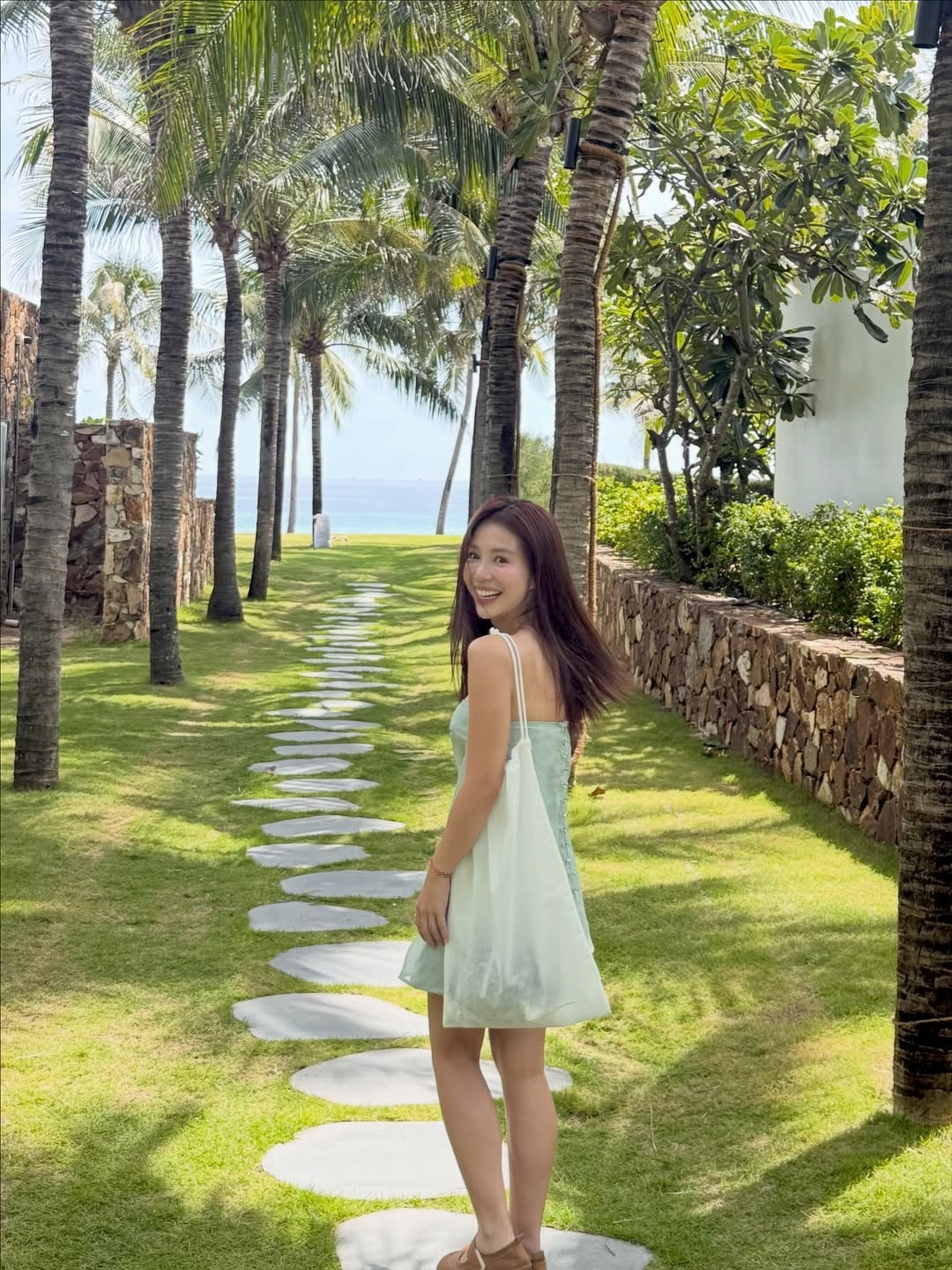 Dù là khoảnh khắc ngồi thư giãn trên bãi cỏ, tươi cười rạng rỡ dưới bóng dừa hay bước đi trên con đường đá lát giữa hai hàng cọ, Mẫn Tiên đều toát lên vẻ đẹp trong trẻo, tự nhiên và vô cùng thoải mái. (Ảnh: IGNV)