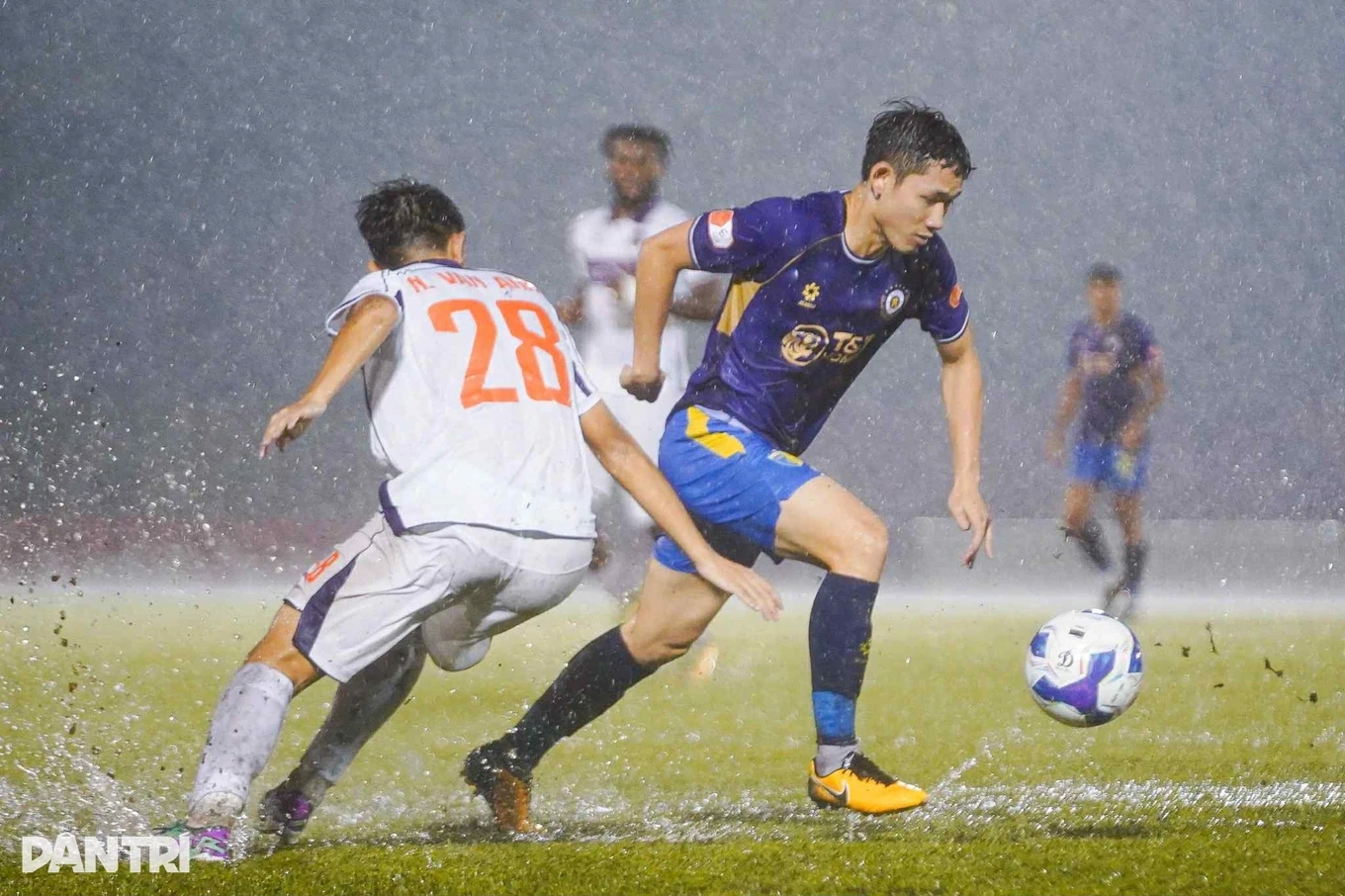 Cơn mưa lớn ảnh hưởng đến trận đấu (Ảnh: Khoa Nguyễn).