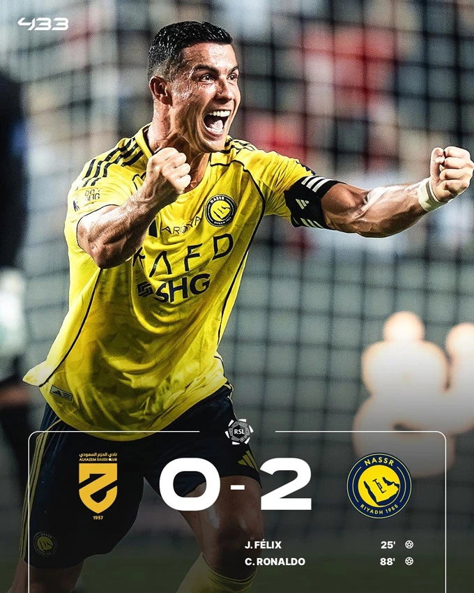 Al Nassr thắng Al Hazm 2-0 nhờ các bàn của Joao Felix và Cristiano Ronaldo. Đội bóng của CR7 tiếp tục dẫn đầu bảng với chuỗi toàn thắng, đồng thời nối dài mạch bất bại trước Al Hazm lên 6 trận.