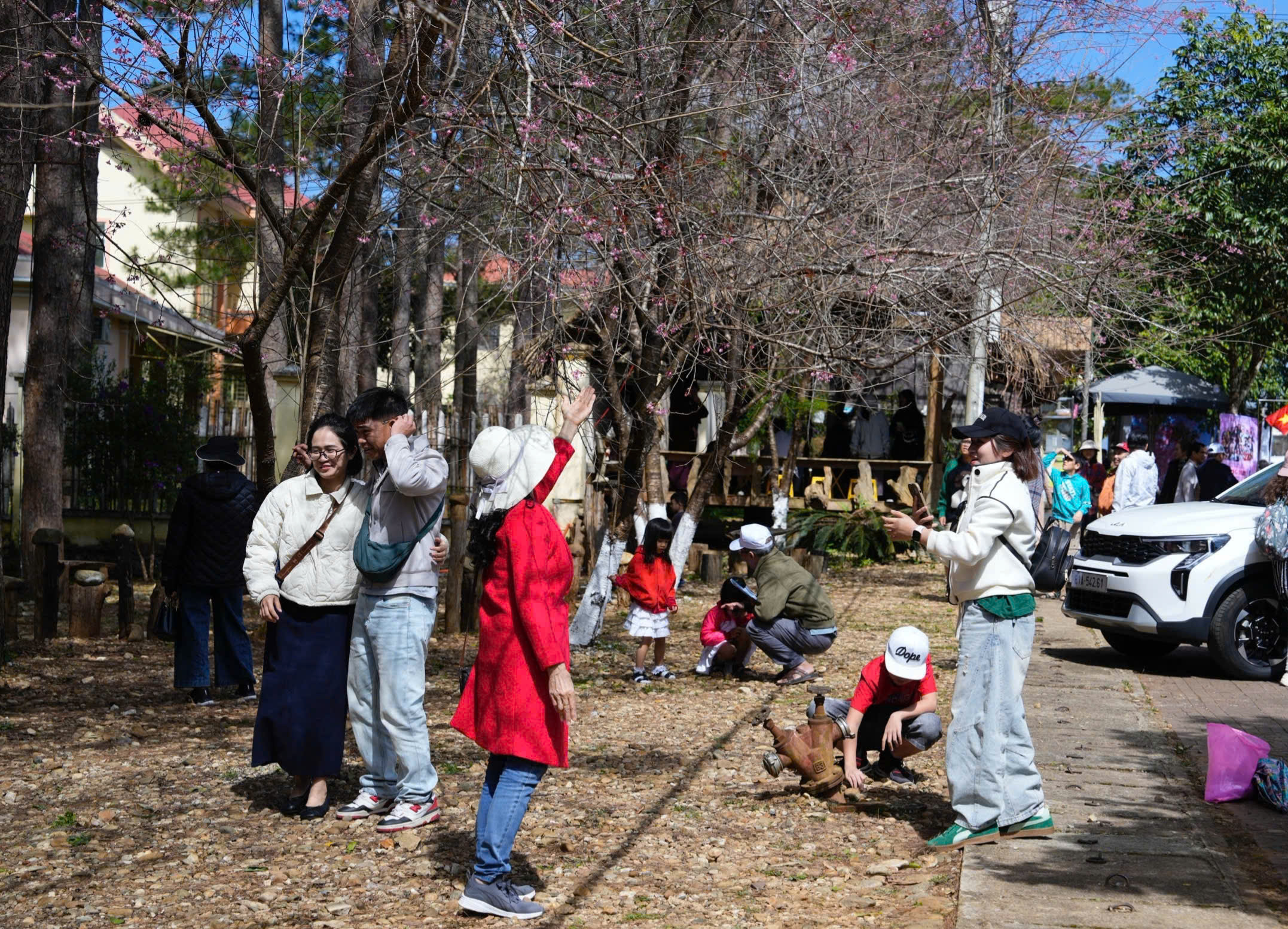 Du khách chụp ảnh bên hoa anh đào. Ảnh: HỮU PHÚC