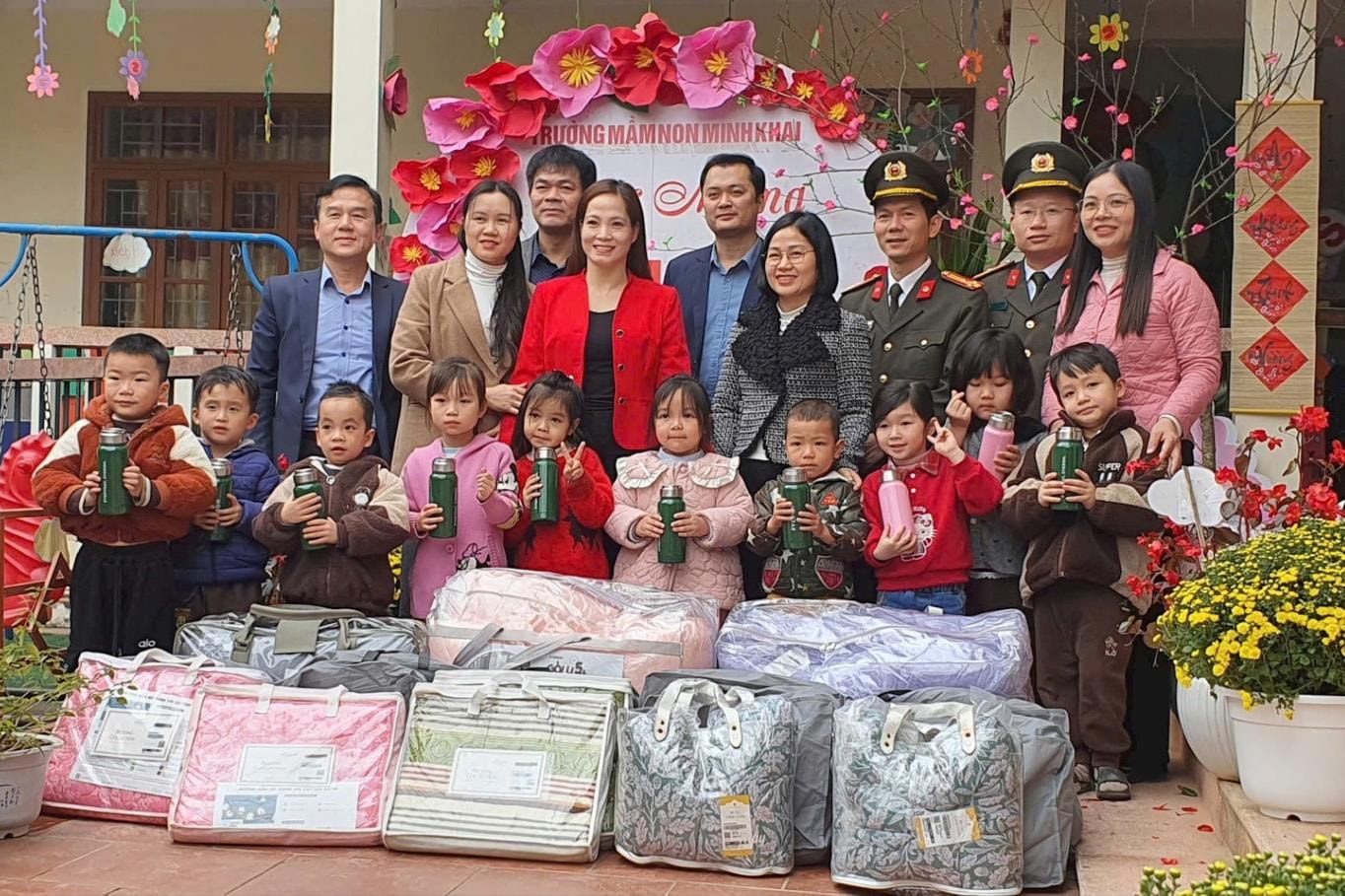 Lãnh đạo Quỹ Bảo trợ trẻ em Việt Nam và đại diện Công ty Cổ phần Everpia tặng quà cho học sinh Trường Mầm non Minh Khai nhân dịp tết Nguyên Đán. Ảnh: Vương Long