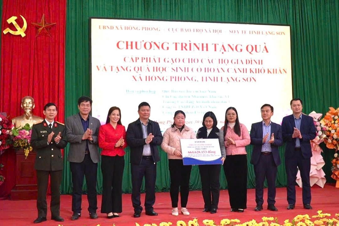 Đại diện Công ty Cổ phần Everpia trao biển hỗ trợ cho trẻ em tỉnh Lạng Sơn. Ảnh: Vương Long.