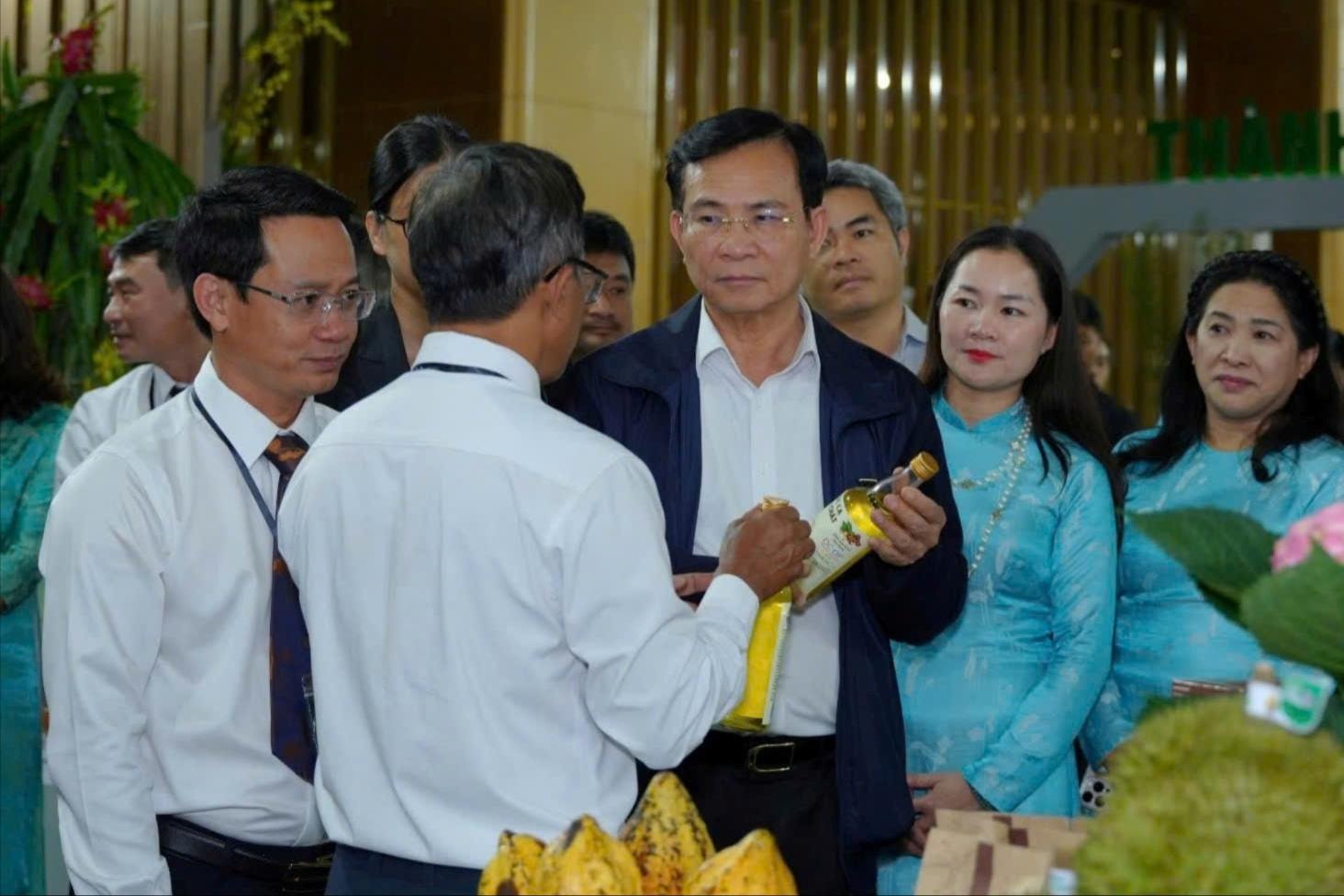 Đồng chí Hồ Văn Mười, Phó Bí thư Tỉnh ủy, Chủ tịch UBND tỉnh đã đến tham quan không gian trưng bày và thăm hỏi các đơn vị, doanh nghiệp của tỉnh tham gia Hội chợ