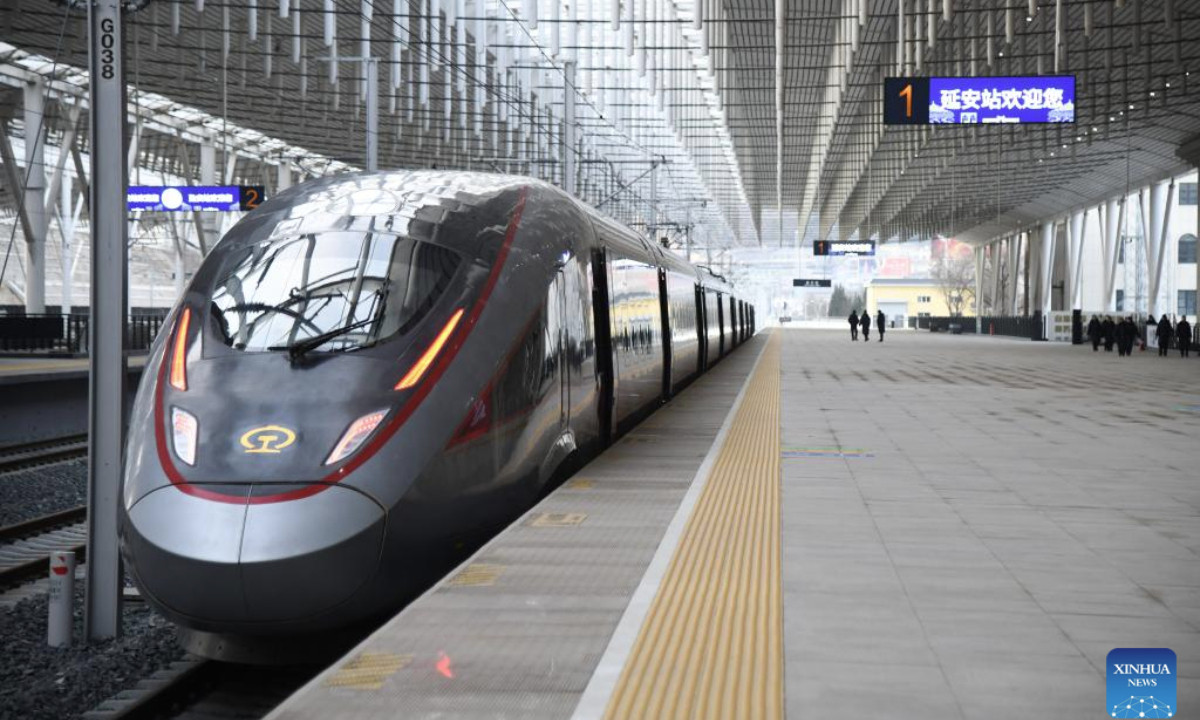 Tàu cao tốc tại ga Diên An thuộc tuyến đường sắt cao tốc mới Tây An – Diên An, tỉnh Thiểm Tây, Tây Bắc Trung Quốc. (Ảnh: Tân Hoa Xã)