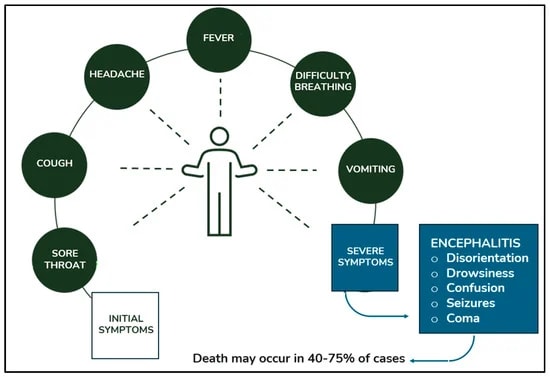 Người bệnh nhiễm virus Nipah có thể biểu hiện với nhiều triệu chứng khác nhau, từ bệnh nhẹ đến viêm não nặng và có thể gây tử vong. Nguồn: MDPI
