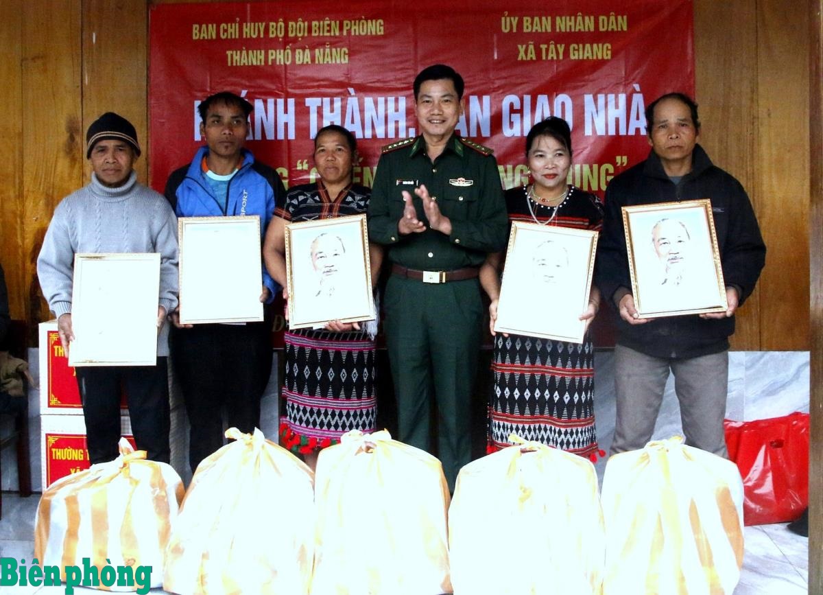 Lãnh đạo Bộ đội Biên phòng thành phố Đà Nẵng trao tặng quà cho các hộ dân trong căn nhà mới được Bộ đội Biên phòng xây dựng. Ảnh: Bùi Cường
