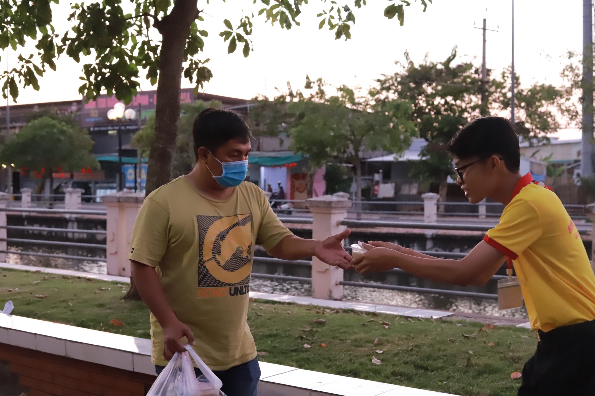 Tình nguyện viên Nguyễn Lê Anh Tú tham gia phát cháo cho bệnh nhân và thân nhân tại bệnh viện. Ảnh: Nhân vật cung cấp.