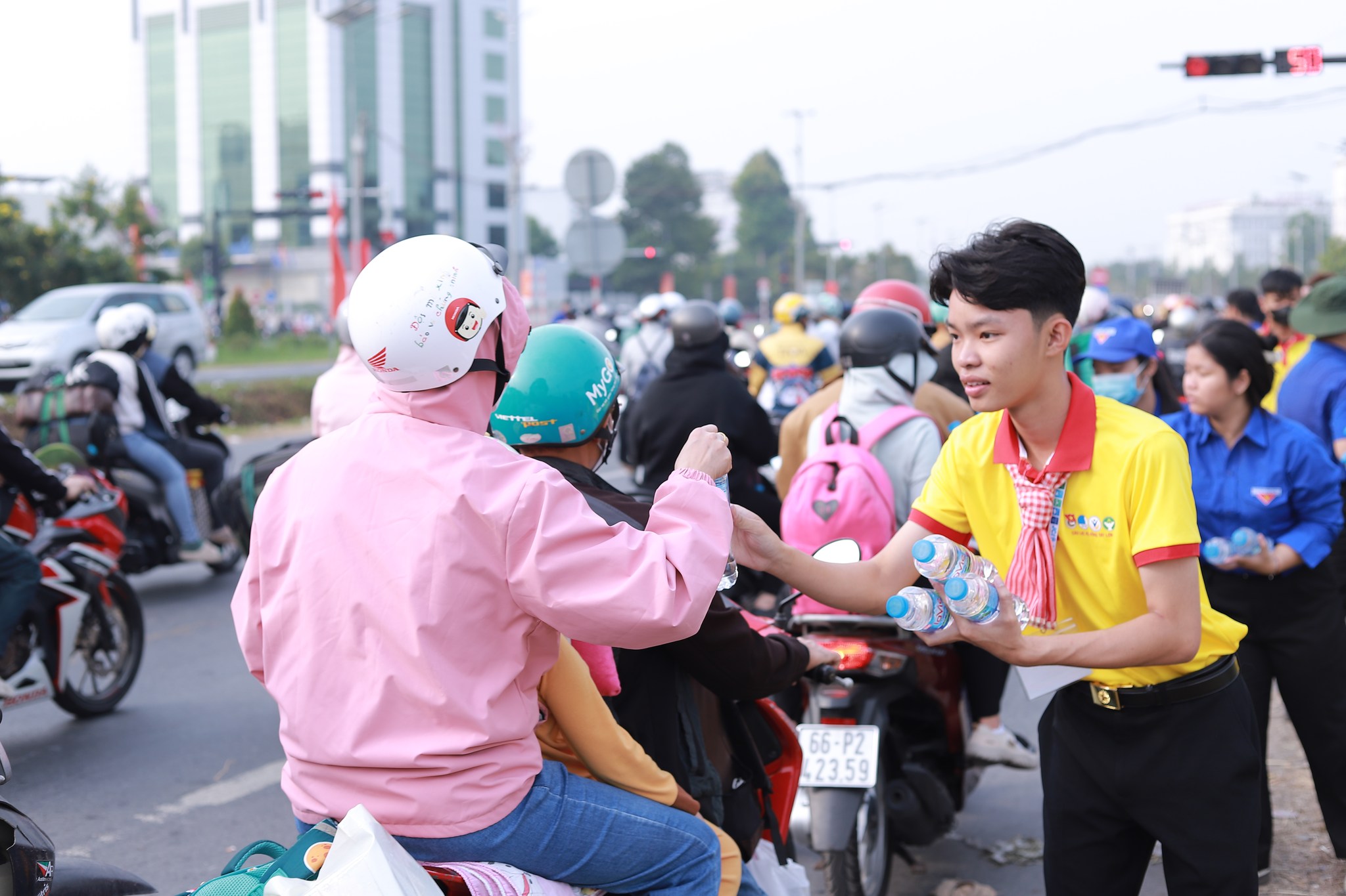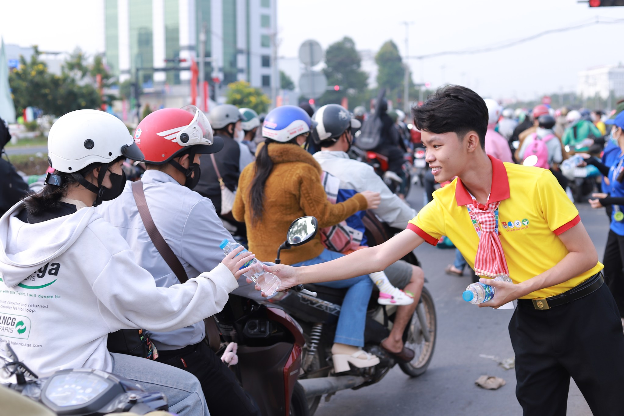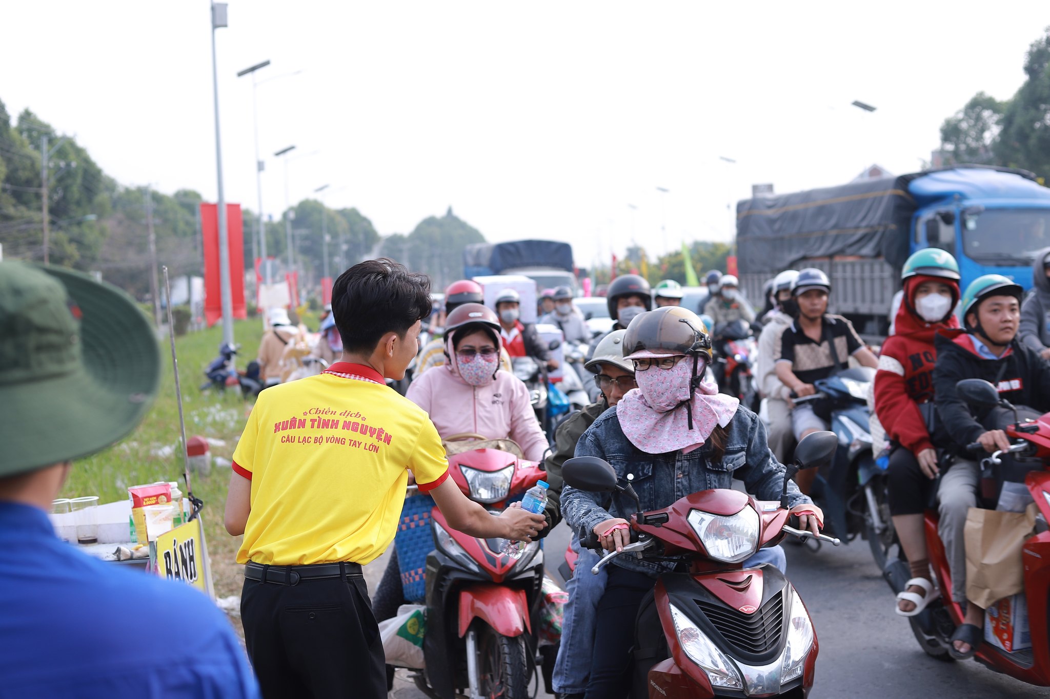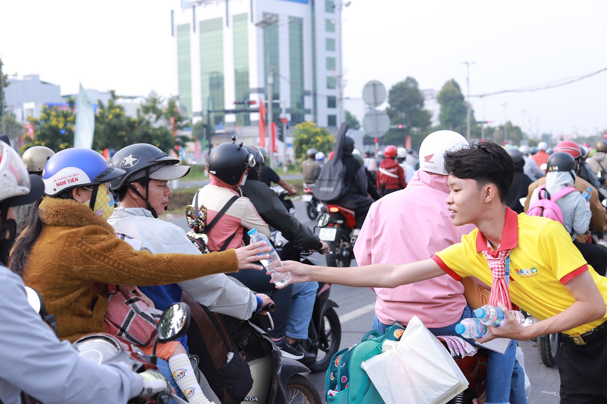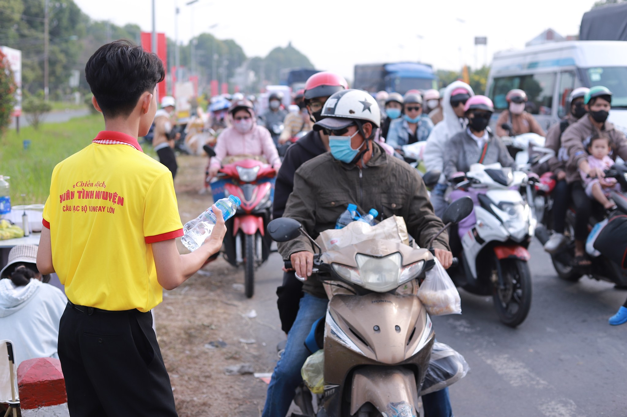 Tình nguyện viên Nguyễn Lê Anh Tú tham gia phát nước suối cho người lao động đi xe máy từ TPHCM về các tỉnh miền Tây đón Tết. Ảnh: Nhân vật cung cấp.