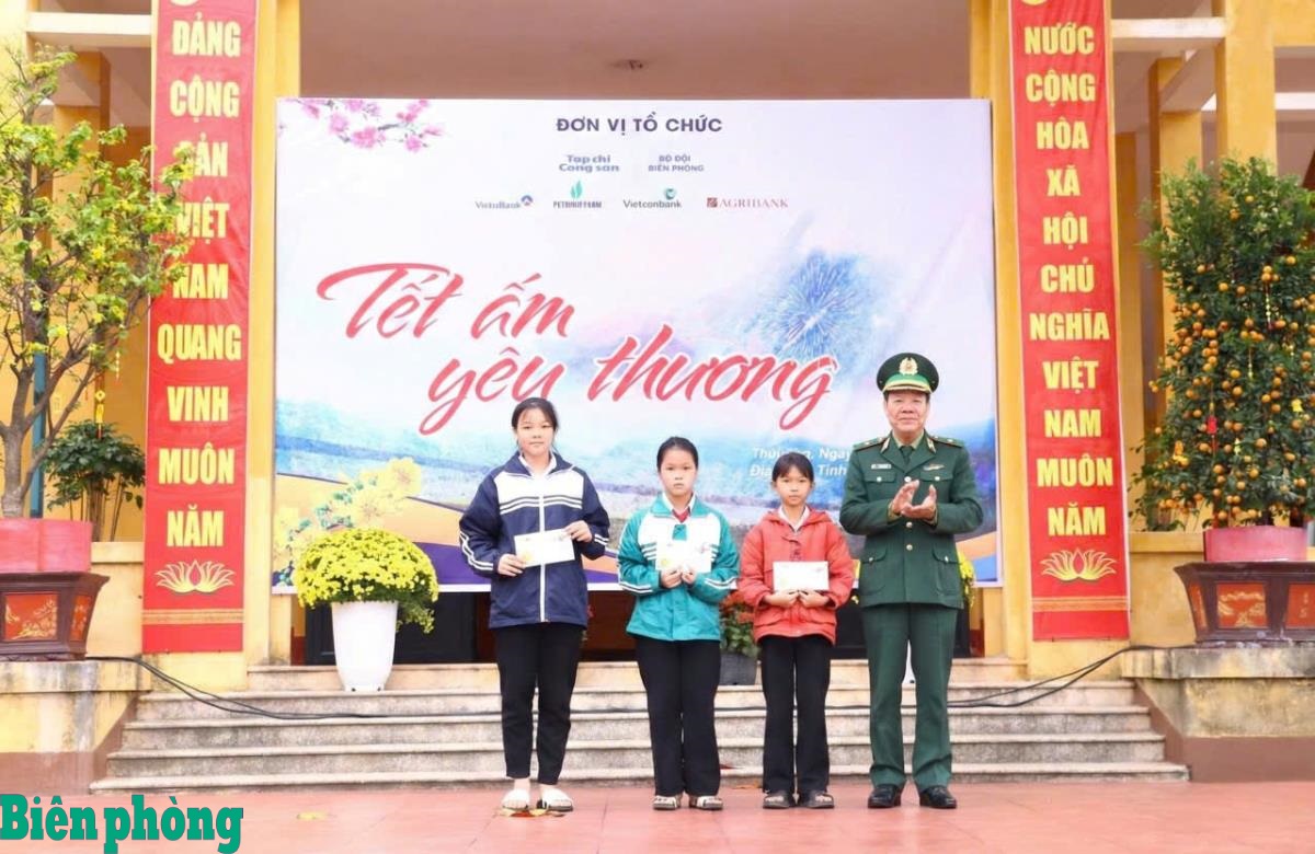 Thiếu tướng Văn Ngọc Quế, Phó Chủ nhiệm Chính trị Bộ đội Biên phòng trao quà Tết tặng các cháu học sinh trong Chương trình “Nâng bước em tới trường - Con nuôi đồn Biên phòng” trên địa bàn phường Hoành Sơn, tỉnh Hà Tĩnh tại Chương trình “Tết ấm yêu thương” do Bộ đội Biên phòng tỉnh Hà Tĩnh, Tạp chí Cộng sản chủ trì, phối hợp với Bộ Tư lệnh Bộ đội Biên phòng cùng các cơ quan, đơn vị liên quan tổ chức. Ảnh: Chiến Khu