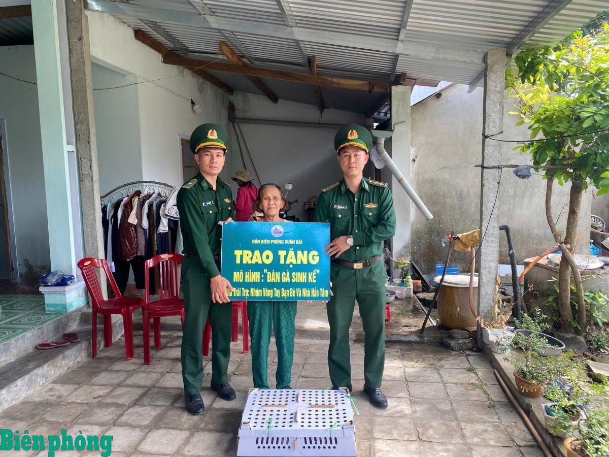 Cán bộ Đồn Biên phòng Xuân Đài, Bộ đội Biên phòng tỉnh Đắk Lắk trao tặng mô hình “Đàn gà sinh kế” cho các hộ dân có hoàn cảnh khó khăn trên địa bàn, góp phần mang đến niềm vui, động lực để bà con đón mùa xuân mới ấm áp, nghĩa tình. Ảnh: Đơn vị cung cấp