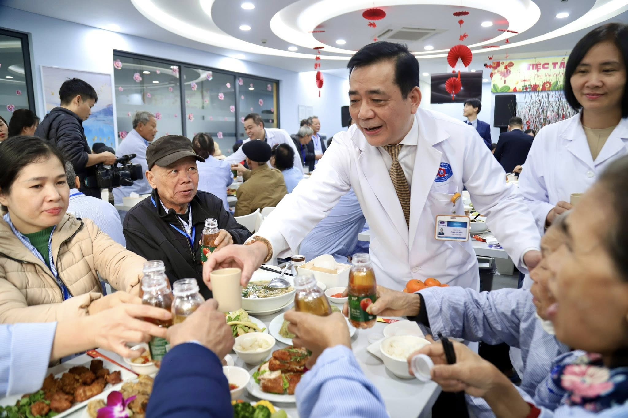 Còn tại Bệnh viện K, chương trình "Tết yêu thương - Cơm sum vầy" được tổ chức tại cơ sở Tam Hiệp (Hà Nội) trong không gian đầm ấm, người bệnh cùng nhau quây quần bên mâm cơm tất niên. Với những bệnh nhân sức khỏe còn yếu, suất cơm được mang đến tận phòng bệnh, để không ai bị bỏ lại phía sau trong khoảnh khắc đoàn viên này.