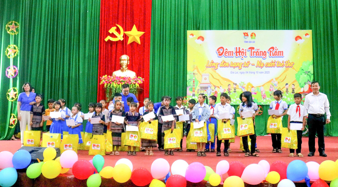 Dịp này, Tỉnh Đoàn Gia Lai trao tặng 100 suất quà cho các em thiếu nhi có hoàn cảnh khó khăn, mỗi suất trị giá 300 nghìn đồng. Những phần quà nhỏ nhưng chứa đựng tình cảm và sự sẻ chia, giúp các em đón một mùa Trung thu đủ đầy và ấm áp hơn.