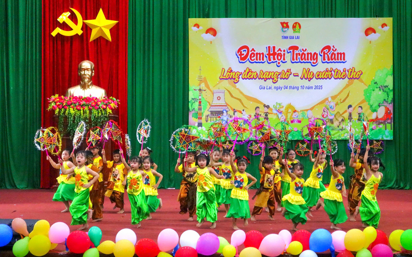 Tiếng trống lân rộn rã, những điệu múa sôi nổi cùng ánh đèn lồng lung linh tạo nên không khí hội Trung thu đầy sắc màu cho các em thiếu nhi vùng cao tỉnh Gia Lai.