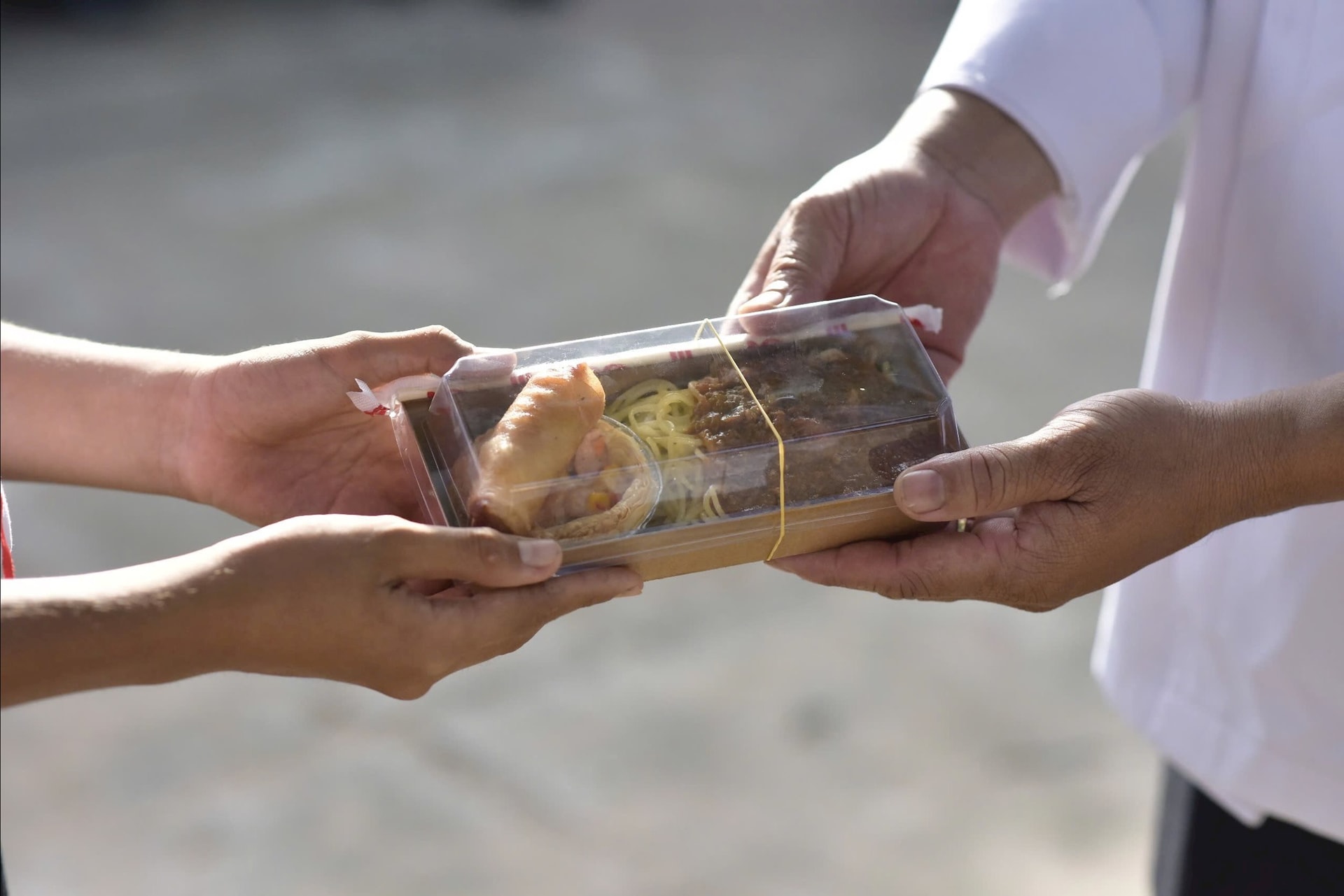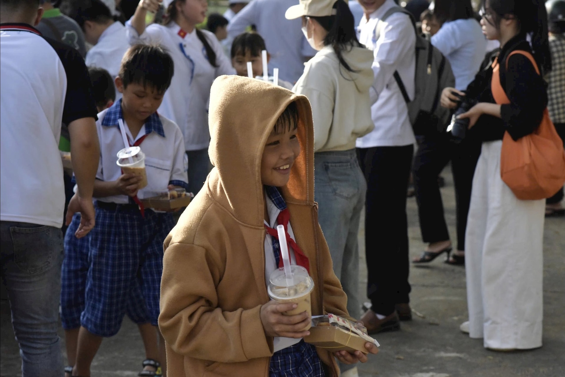 Niềm vui khi nhận được thức ăn và các ly trà sữa do các cô chú đầu bếp tự tay làm