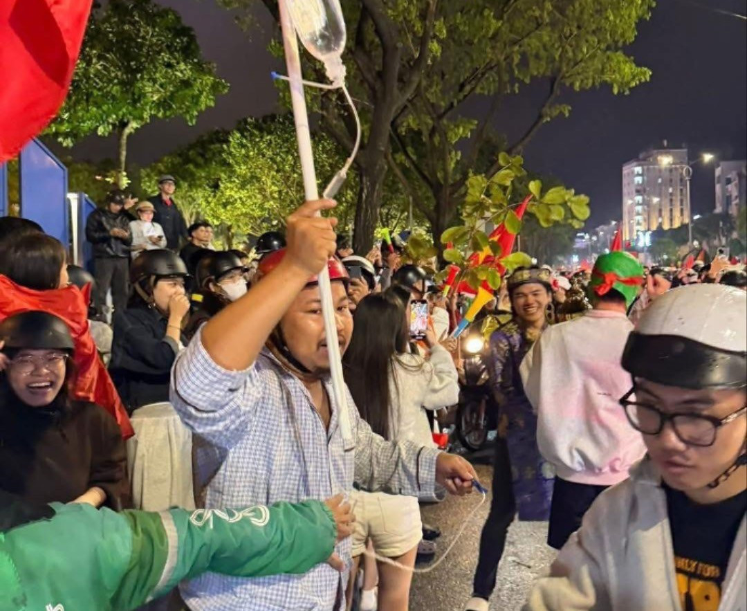 Trang mạng xã hội về đời sống có hơn 3 triệu người theo dõi gây sốt với loạt ảnh người dân đổ ra đường, ăn mừng theo cách riêng. Có người kéo theo thùng rác, vác cây cối đi ăn mừng. Một số góc máy ghi lại được hình ảnh bệnh nhân cầm theo thiết bị truyền nước ra đường "đi bão".