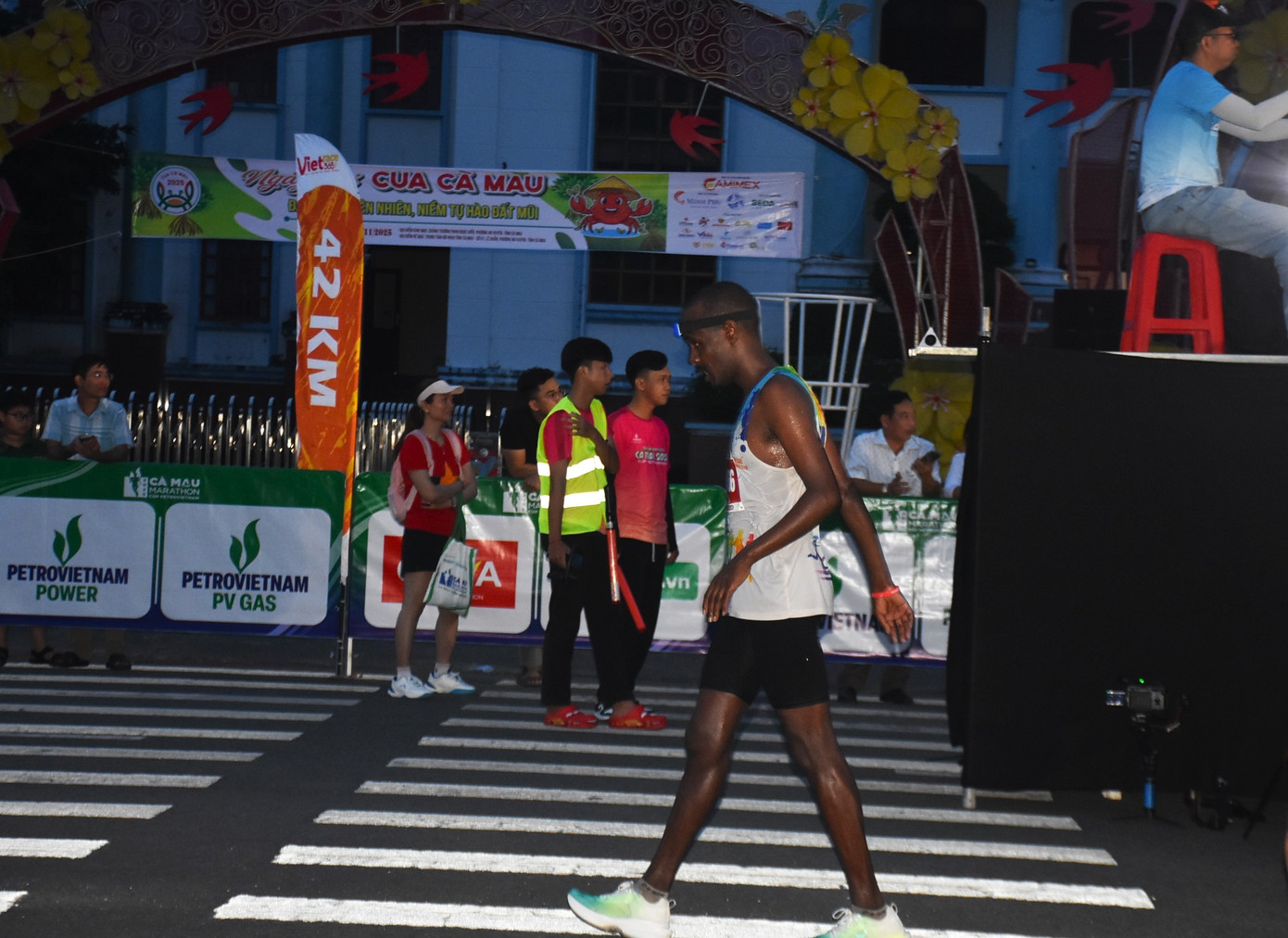 Khoảnh khắc chờ đón VĐV đầu tiên về đích ở cự ly 42km.