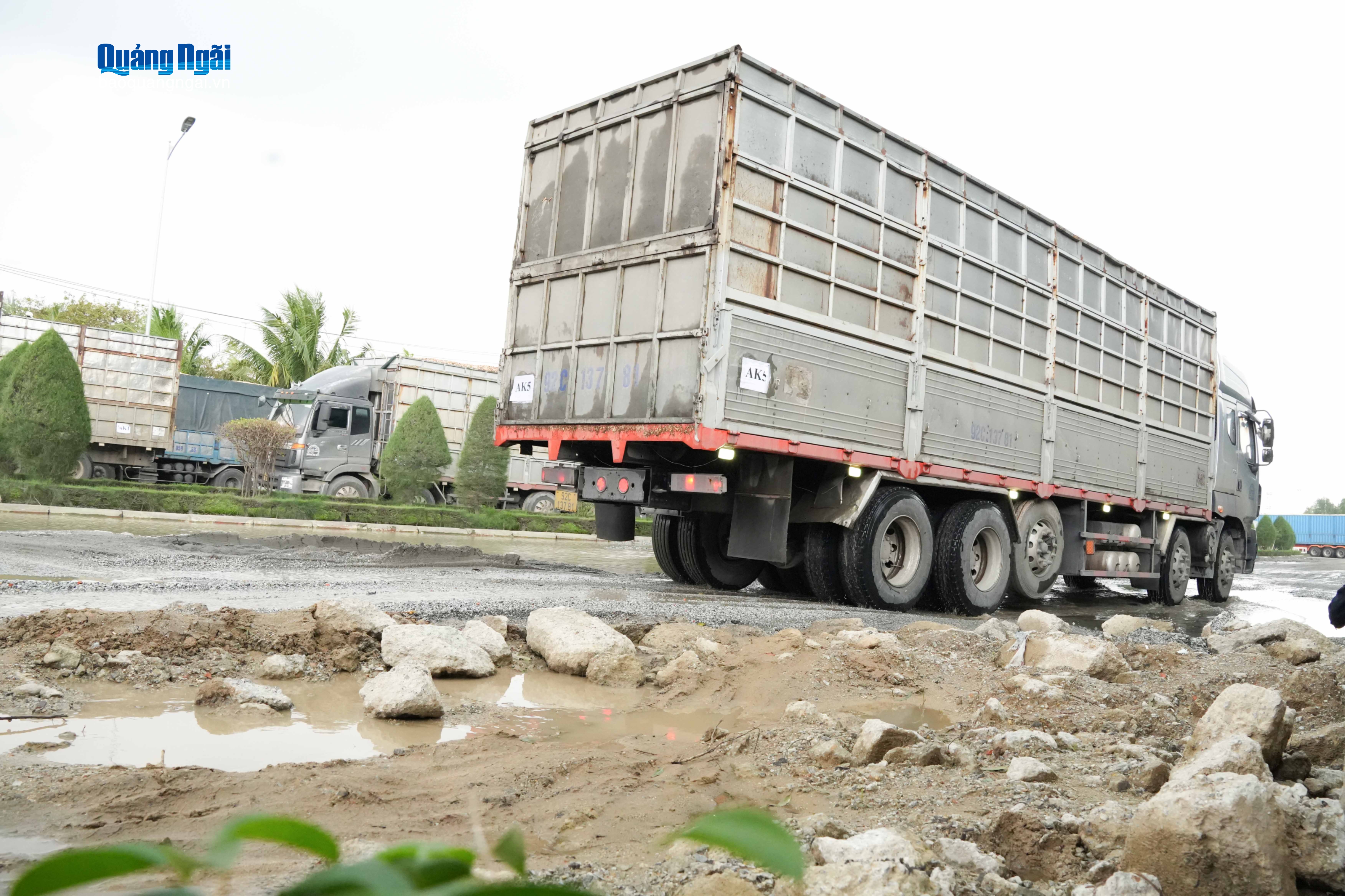 Phía trước cổng cảng Quốc tế Gemadept Dung Quất xuất hiện dày đặc ổ gà.