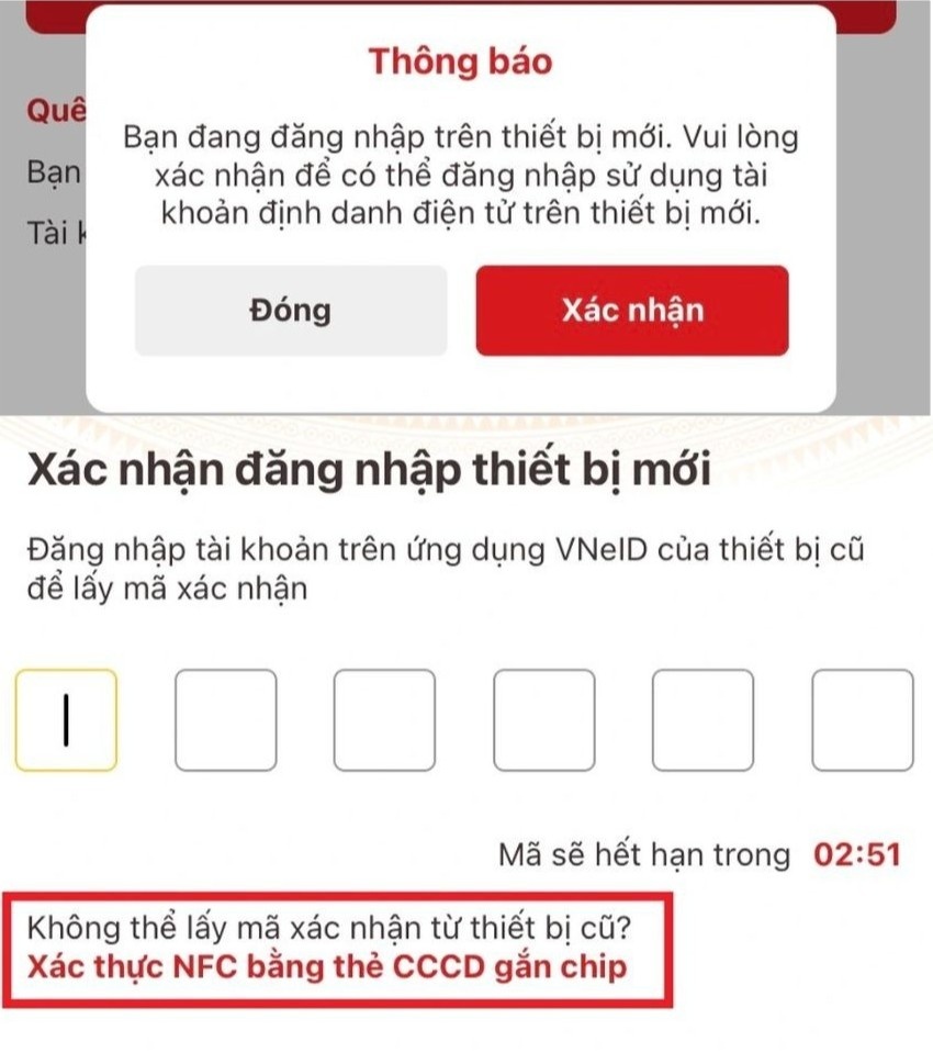 Bước 3: Hệ thống sẽ hiển thị thông báo đang đăng nhập trên điện thoại mới, ấn Xác nhận. Lúc này, một mã xác thực đã được gửi đến điện thoại cũ, nhưng do đã bị mất, người dùng tiếp tục ấn vào mục Xác thực NFC bằng thẻ CCCD gắn chip.