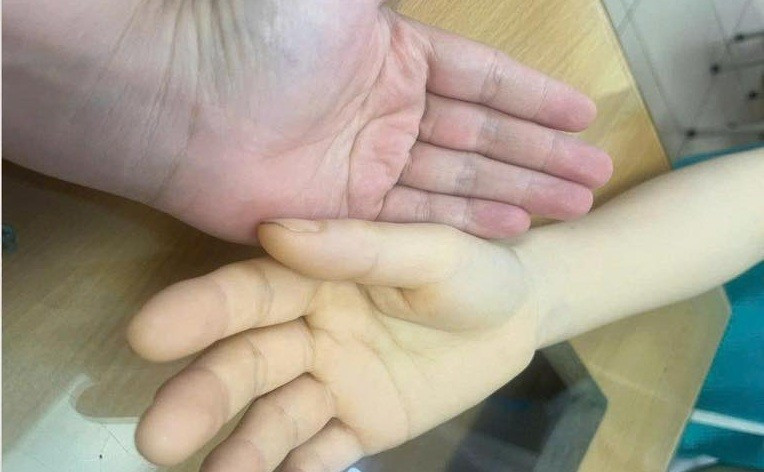 Bàn tay bệnh nhân (bên phải) vàng da vì mất máu.