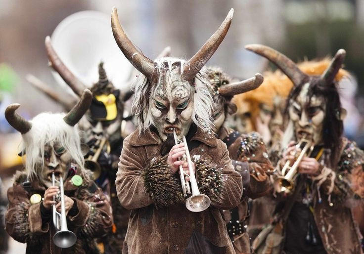 Mặt nạ trong các cuộc rước đêm Trung Cổ. Ở châu Âu thời Trung Cổ, các đoàn người hóa trang thành ma, thiên thần hoặc quỷ dữ đi khắp làng trong đêm 31/10. Mặt nạ bằng vải, sáp ong hoặc gỗ được chạm khắc tinh xảo, tượng trưng cho sự luân chuyển giữa thiện – ác, sống – chết. Ảnh: Pinterest.