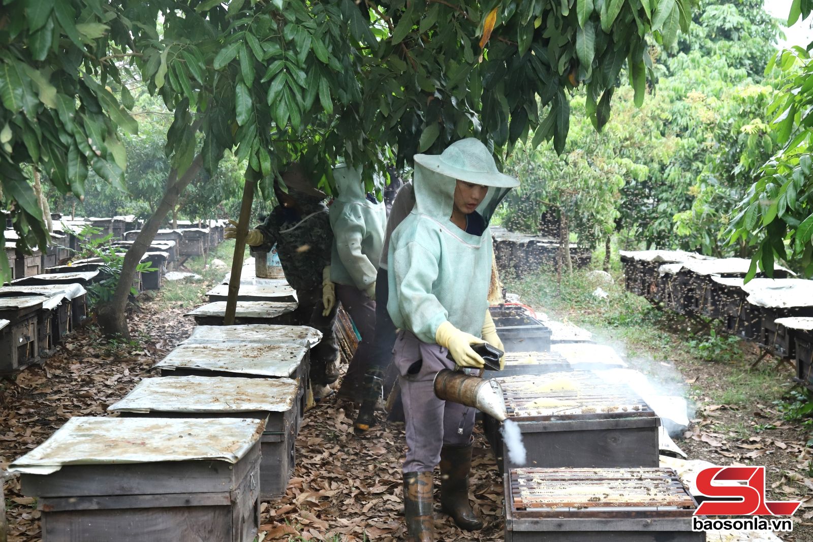 Thành viên HTX nuôi ong mật Sông Mã, xã Sông Mã thu hoạch mật ong mùa hoa nhãn.