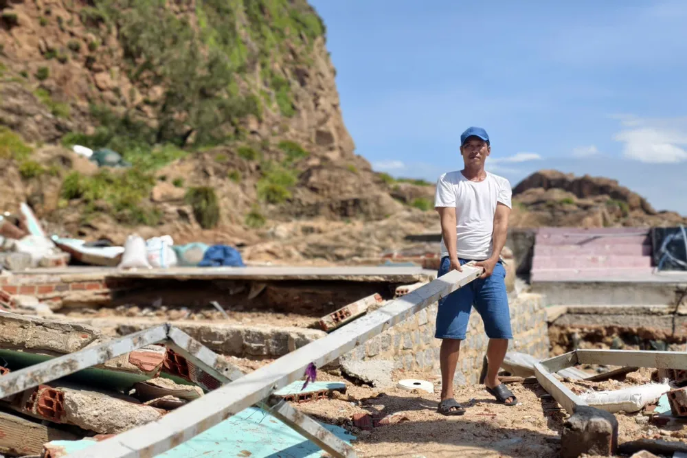 Hai ngày sau bão, ông Lê Thạch Ngọc (44 tuổi, ngụ khu phố Hải Bắc, phường Quy Nhơn Đông) vẫn lẩn quẩn quanh ngôi nhà đổ sập, lượm nhặt những vật dụng còn sót lại. 15 năm sống ở khu vực này, chưa bao giờ ông Thạch chứng kiến cơn bão mạnh đến vậy.