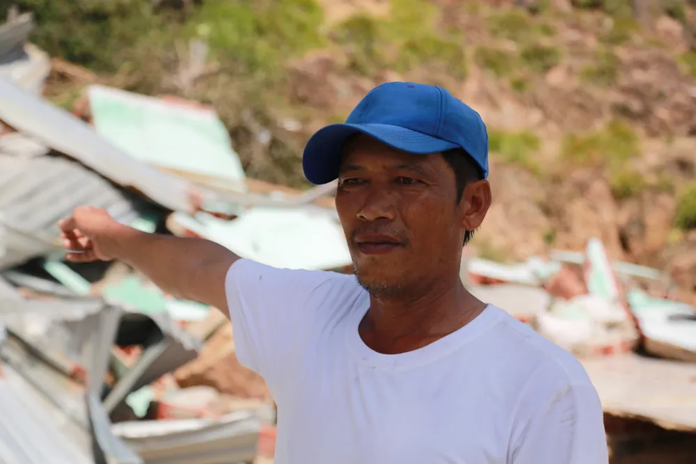 "18 giờ, sóng cao khoảng tám mét, đập lên bờ kè rồi đổ lên nóc làm sập nhà. Một tiếng đồng hồ sau ngớt gió tôi ra xem thấy căn nhà tan tành không còn gì hết.