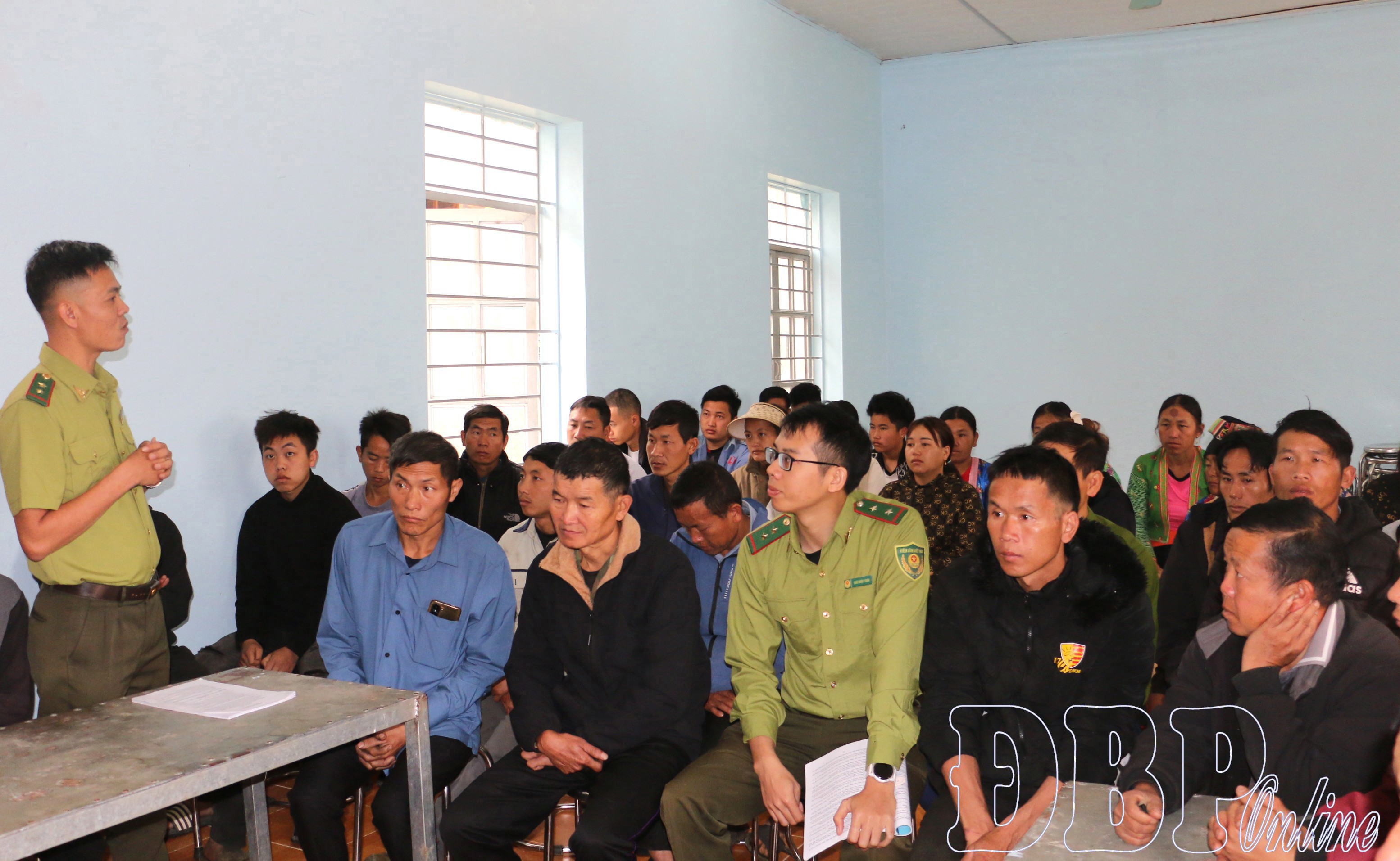 Cán bộ Hạt Kiểm lâm Mường Ảng tuyên truyền pháp luật về bảo vệ rừng đến người dân bản Hua Rốm, xã Nà Tấu.