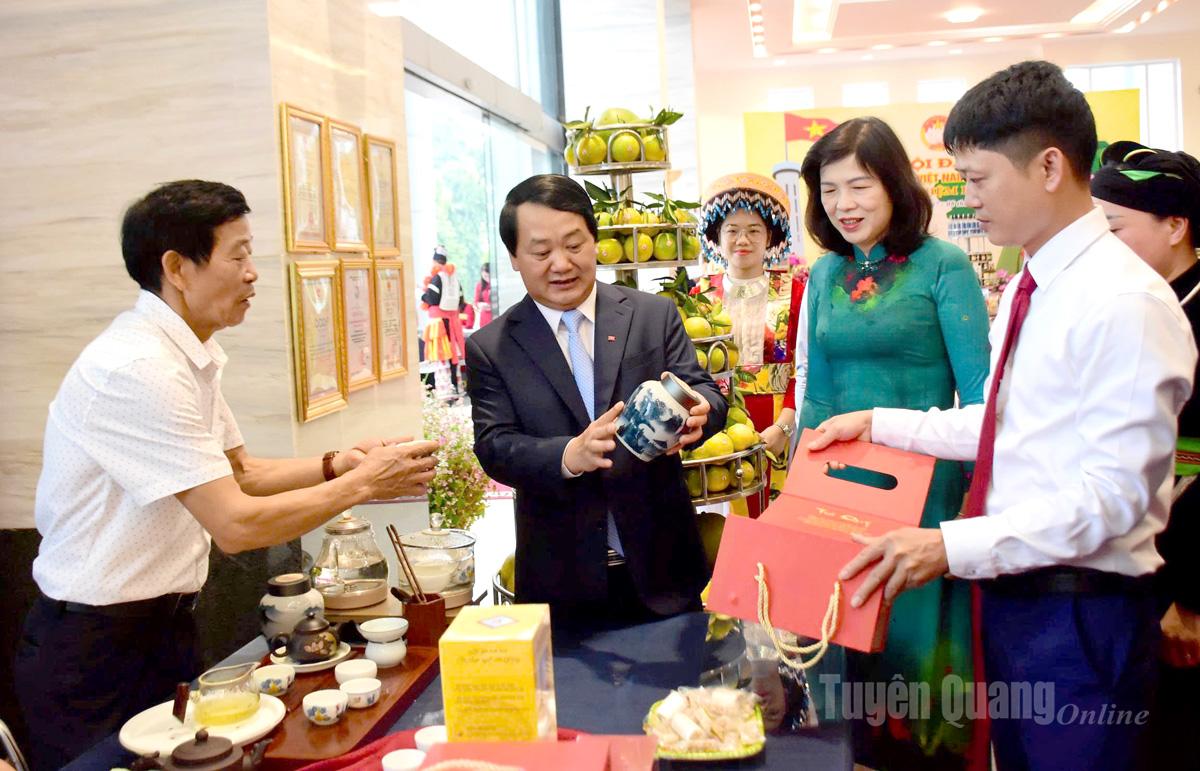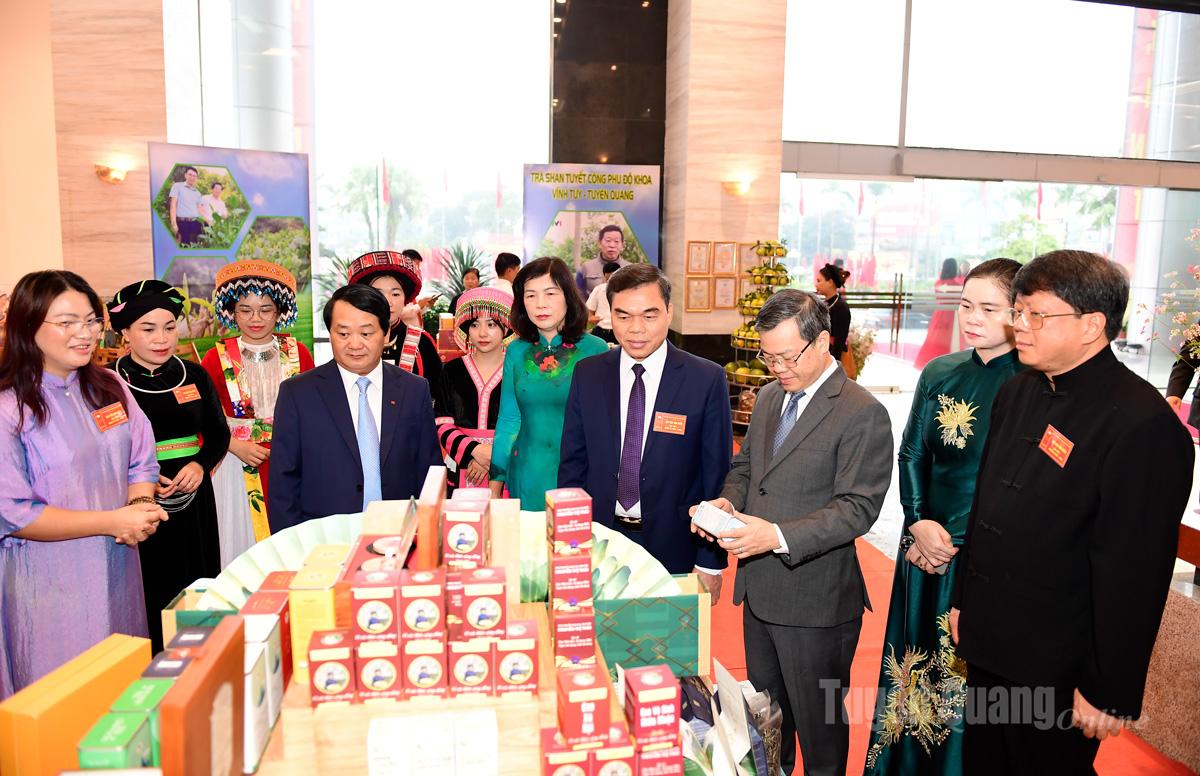 Đồng chí Hầu A Lềnh, Ủy viên Ban Chấp hành Trung ương Đảng, Bí thư Tỉnh ủy Tuyên Quang tham quan các sản phẩm quà tặng từ trà tại gian trưng bày các sản phẩm đặc trưng của tỉnh.